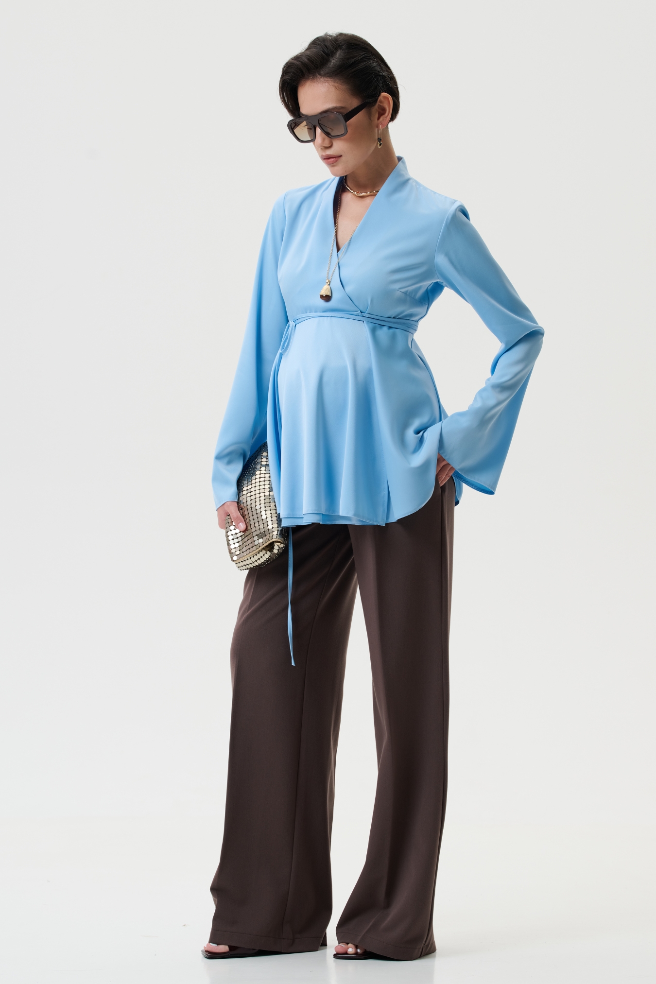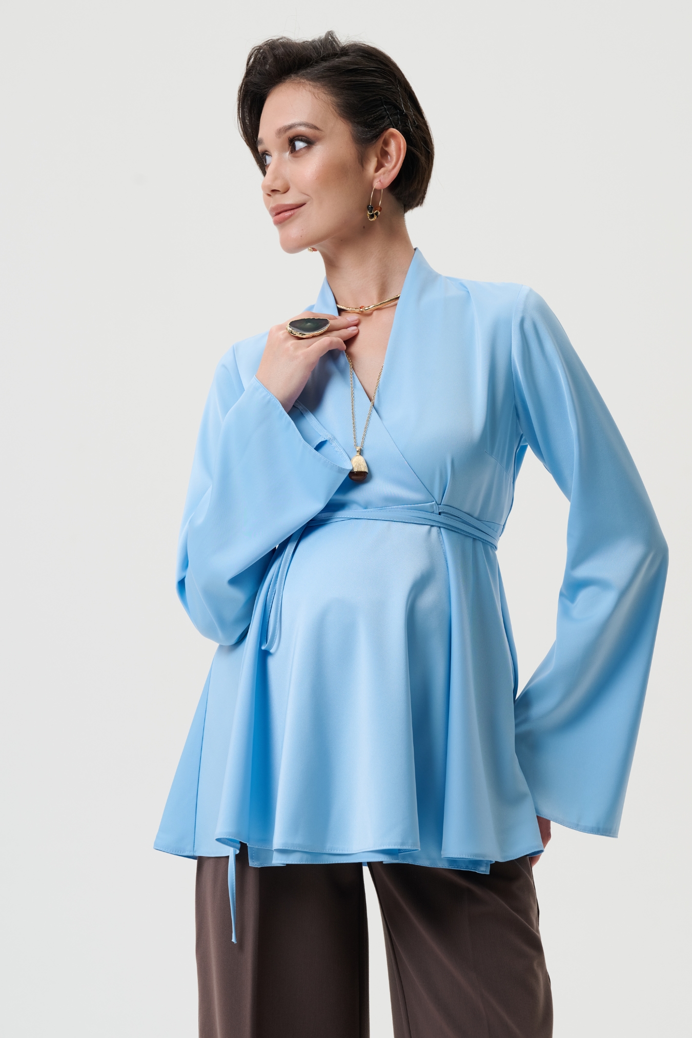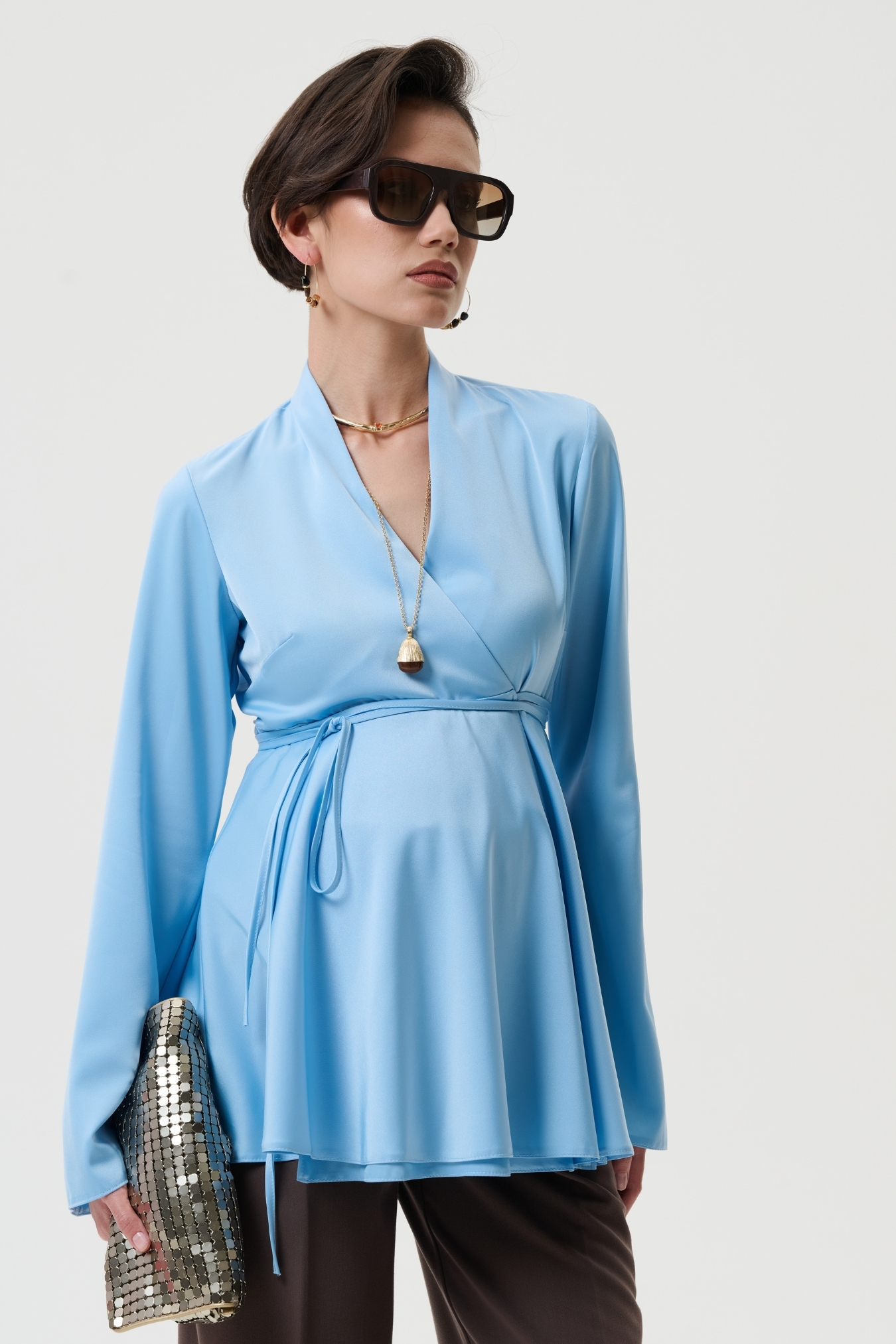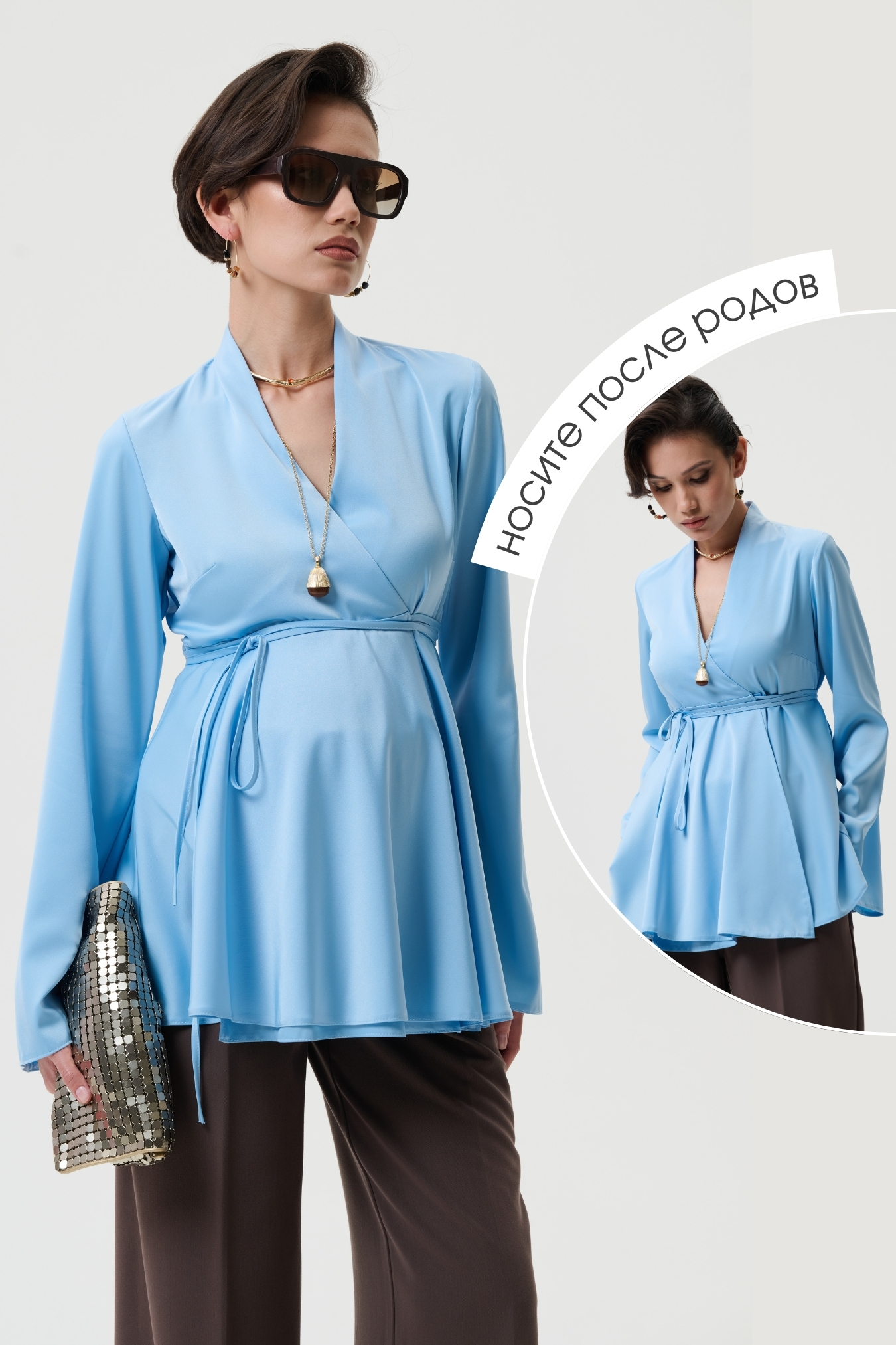 Эта блузка для беременных создана в полуприлегающем силуэте с запахом и поясом на завязки, что позволяет идеально подстраиваться под живот на любом сроке беременности. - Модель универсальна: можно носить как вещи для беременных весна или для беременных одежда осень, создавая стильные наряды для офиса, прогулок или праздничных мероприятий. - Блуза выполнена из сатина с матовым блеском — это 100% полиэстер, который держит форму, является немнущимся материалом, быстро сохнет и остаётся красивым даже после множества стирок. - Вечерняя и праздничная нарядная блузка станет элегантным вариантом для беременных женщин, когда нужен утончённый образ для торжества, выхода в ресторан или стильная офисная одежда для беременных.