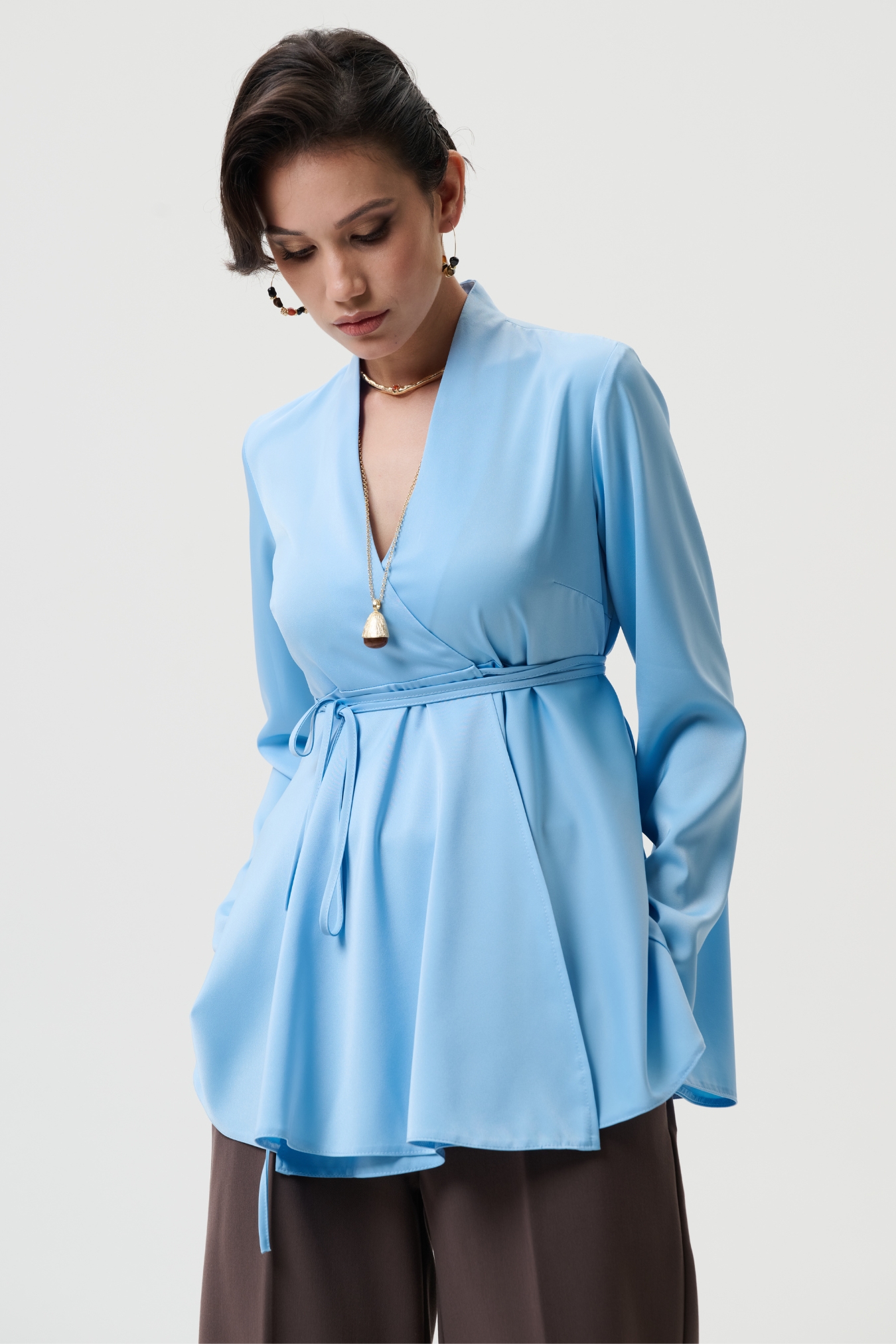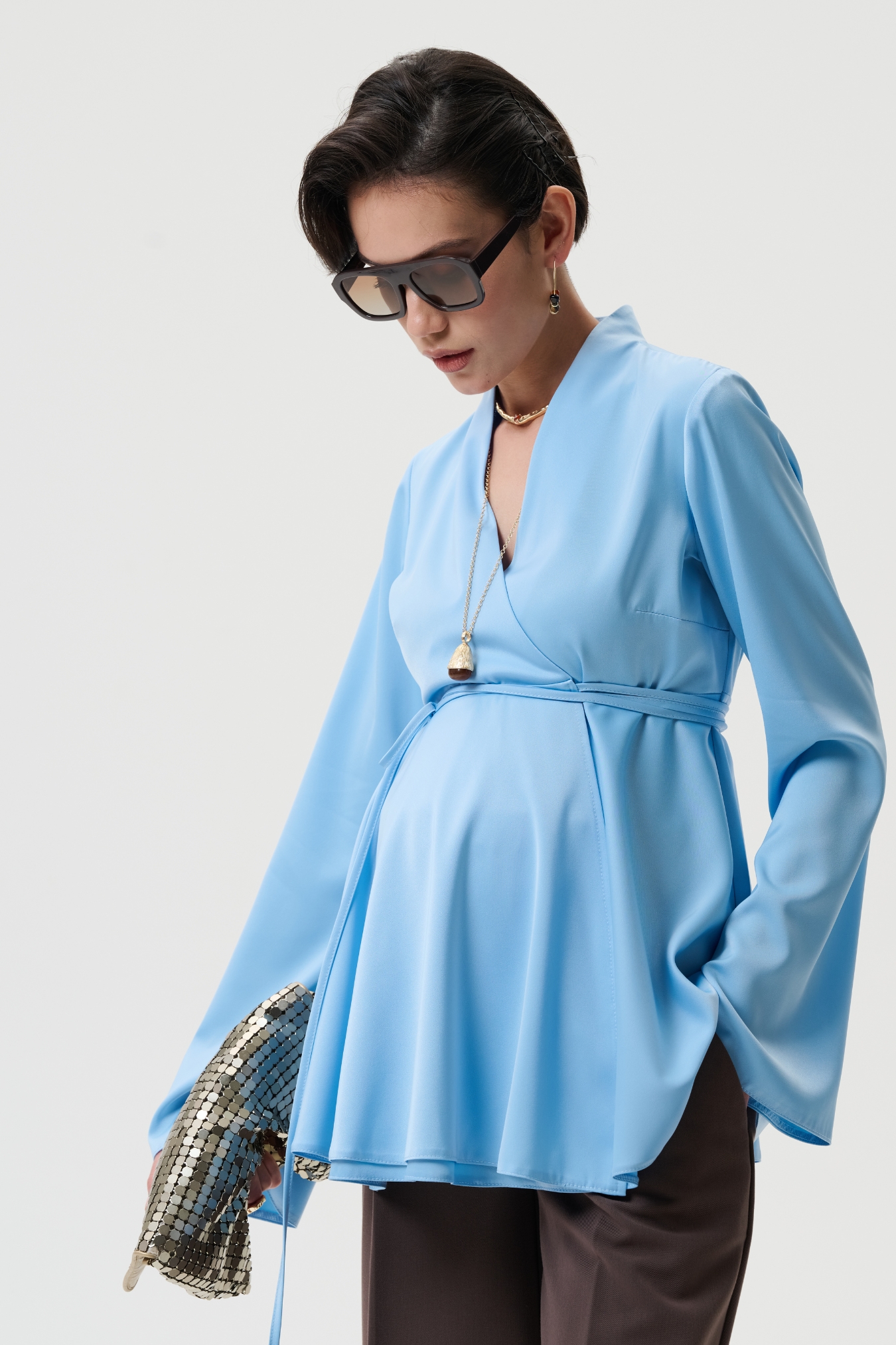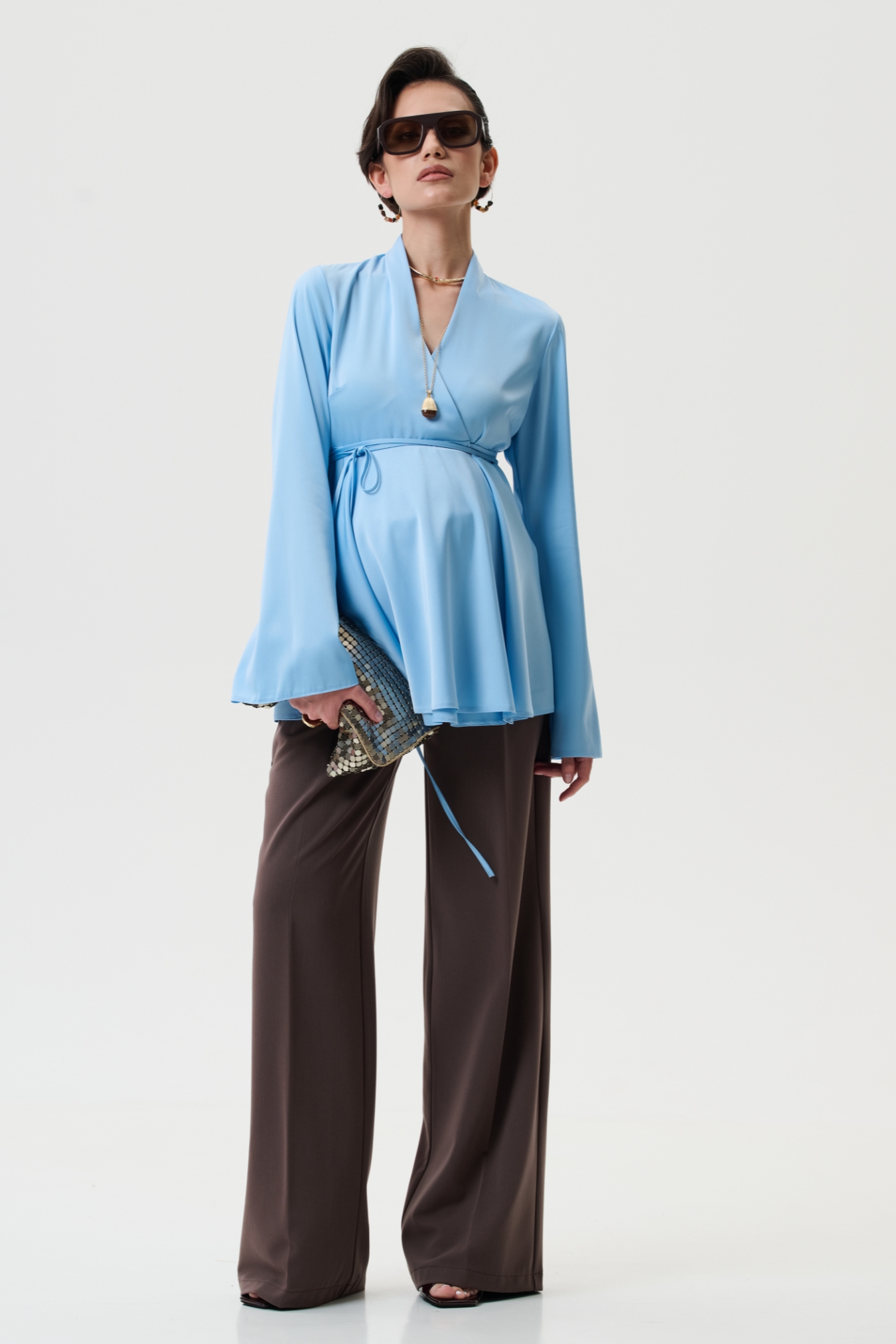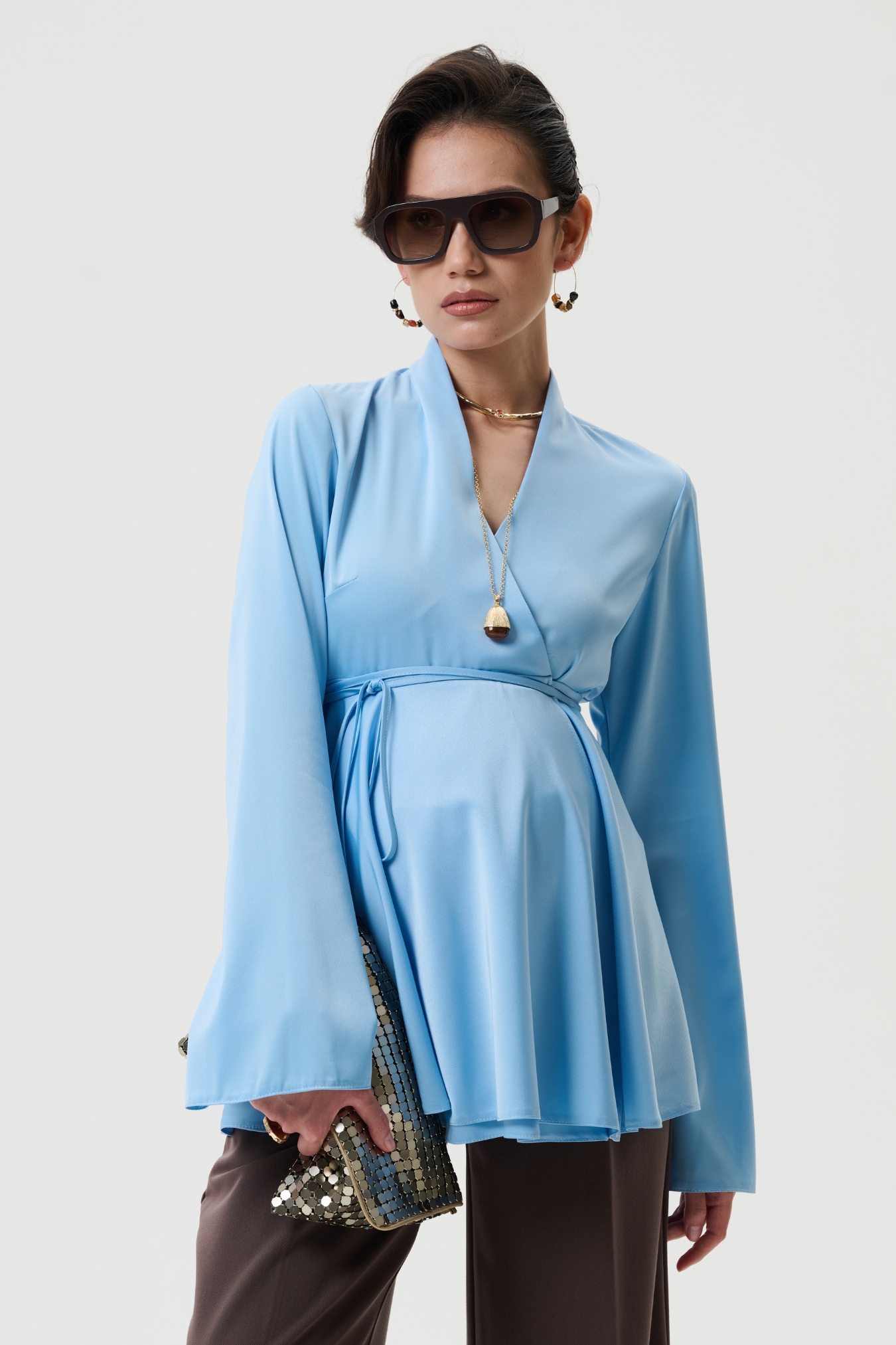 Эта блузка для беременных создана в полуприлегающем силуэте с запахом и поясом на завязки, что позволяет идеально подстраиваться под живот на любом сроке беременности. - Модель универсальна: можно носить как вещи для беременных весна или для беременных одежда осень, создавая стильные наряды для офиса, прогулок или праздничных мероприятий. - Блуза выполнена из сатина с матовым блеском — это 100% полиэстер, который держит форму, является немнущимся материалом, быстро сохнет и остаётся красивым даже после множества стирок. - Вечерняя и праздничная нарядная блузка станет элегантным вариантом для беременных женщин, когда нужен утончённый образ для торжества, выхода в ресторан или стильная офисная одежда для беременных.