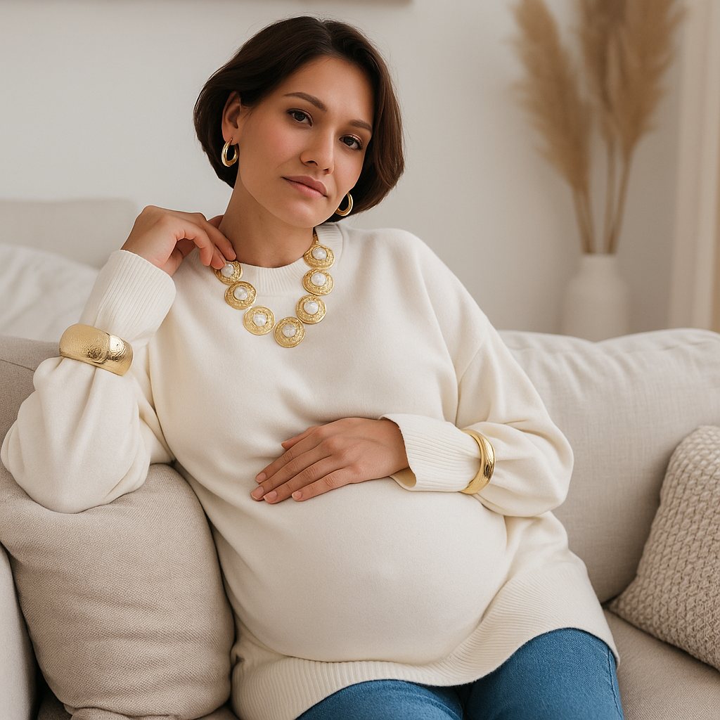 Аккуратная круглая горловина на широкой резинке. Просторные рукава и низ изделия так же разбавлены классической вязаной резинкой. В боковых швах предусмотрены разрезы для дополнительного удобства. Спущенное плечо мягко подчеркивает плечи. Просторный гладко вязанный фасон оверсайз не сковывает движений, будет удобен на любом сроке и после родов.