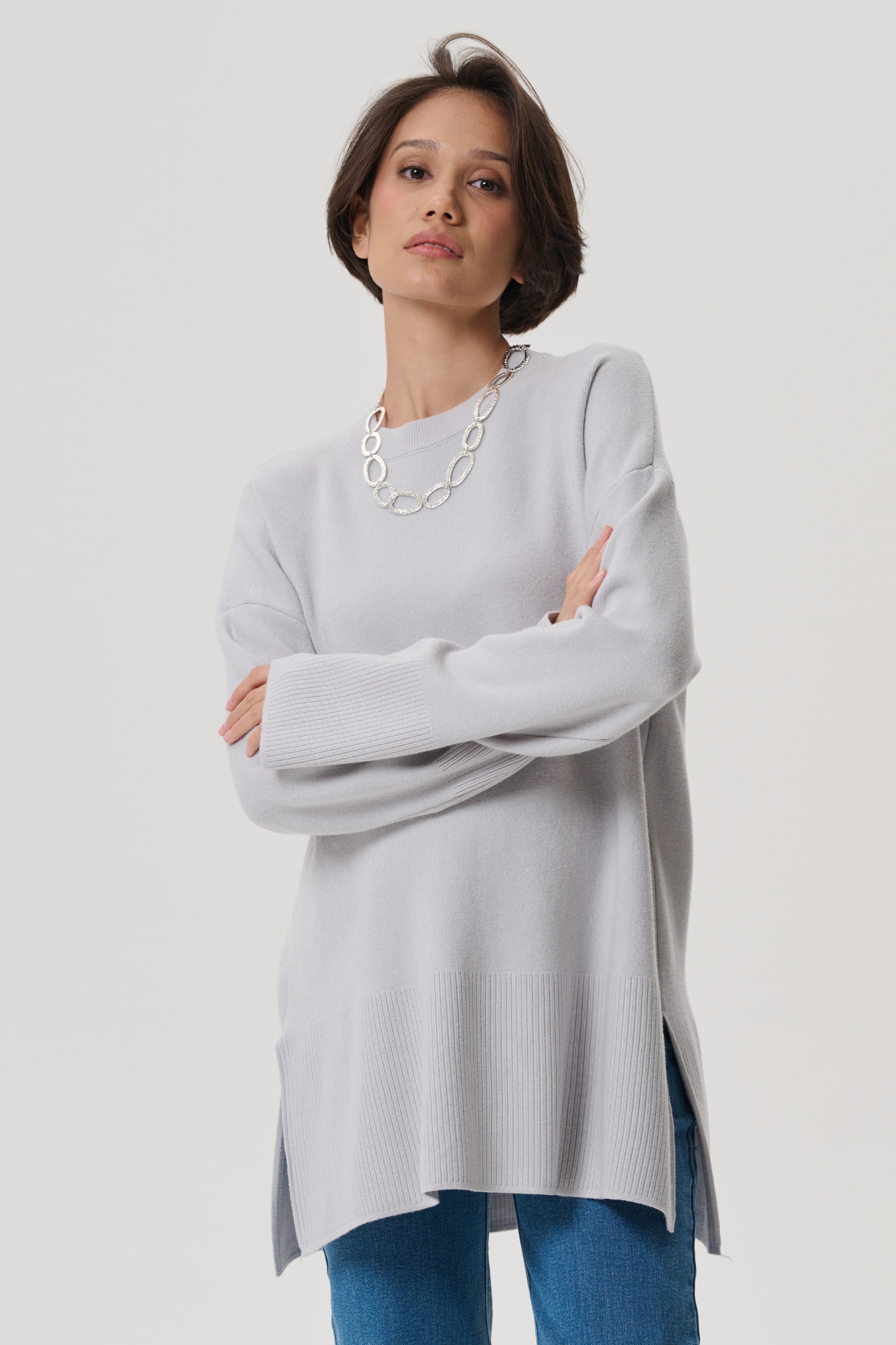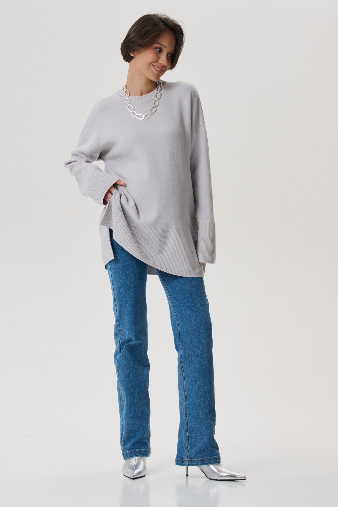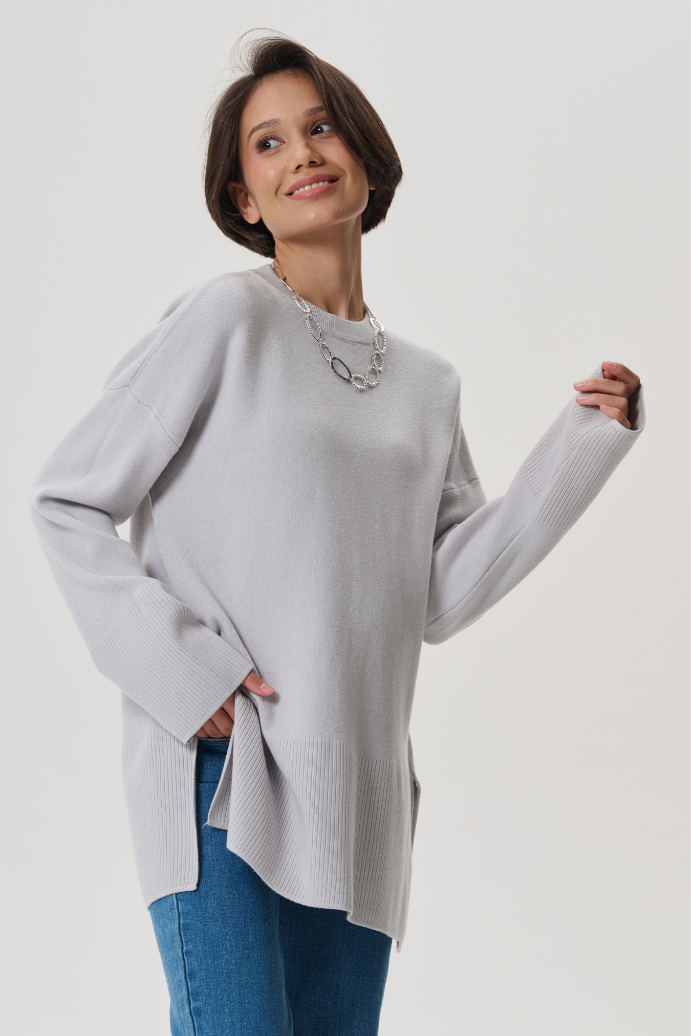 Аккуратная круглая горловина на широкой резинке. Просторные рукава и низ изделия так же разбавлены классической вязаной резинкой. В боковых швах предусмотрены разрезы для дополнительного удобства. Спущенное плечо мягко подчеркивает плечи. Просторный гладко вязанный фасон оверсайз не сковывает движений, будет удобен на любом сроке и после родов.
