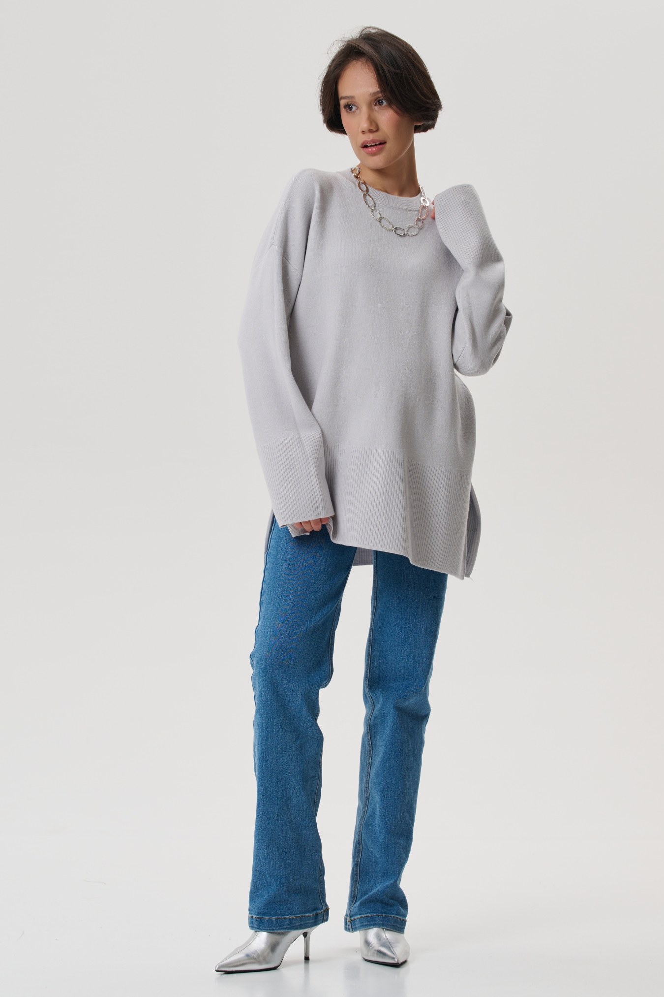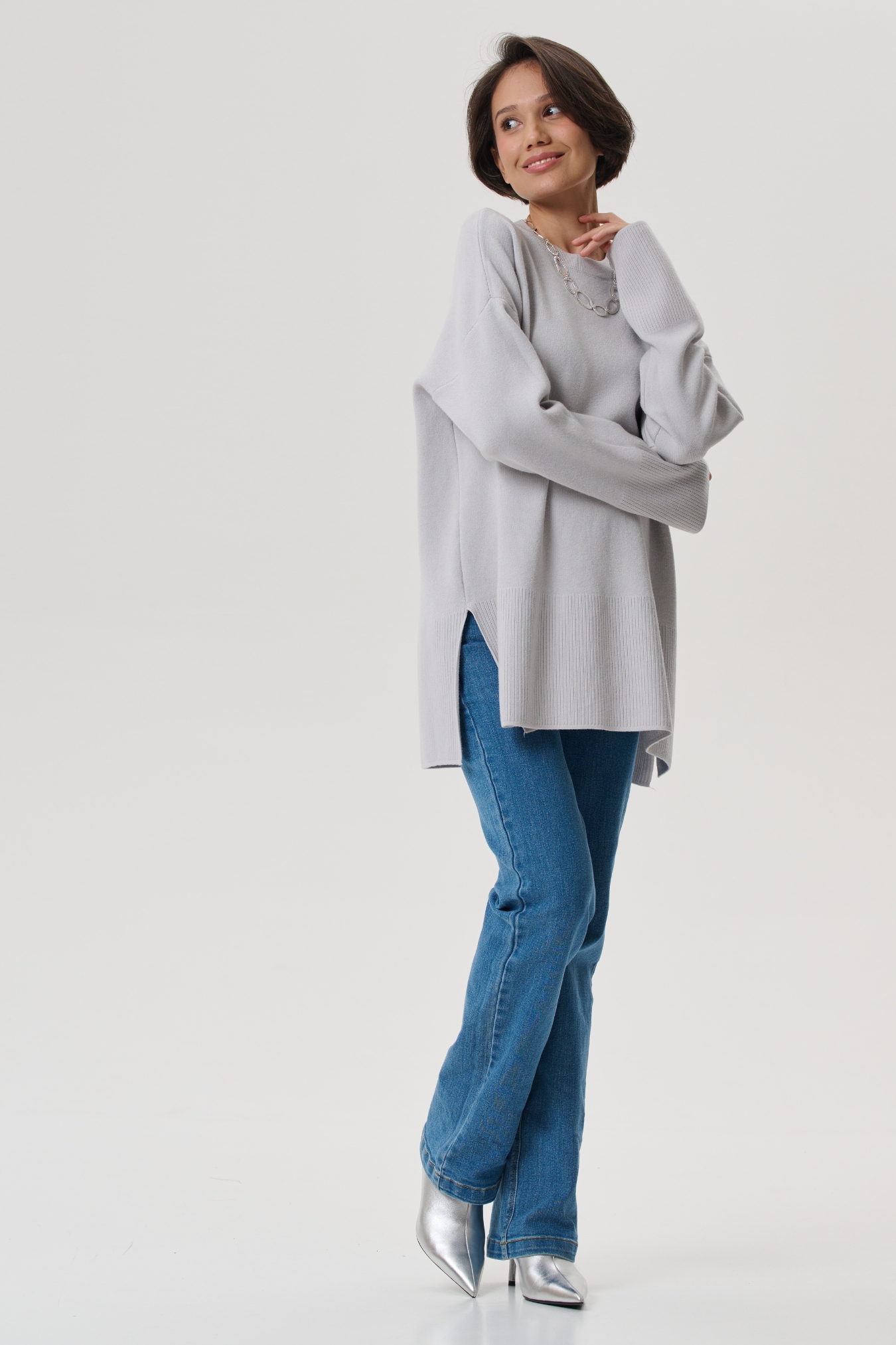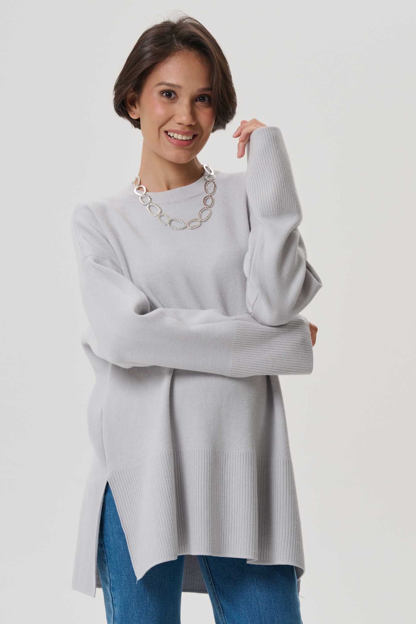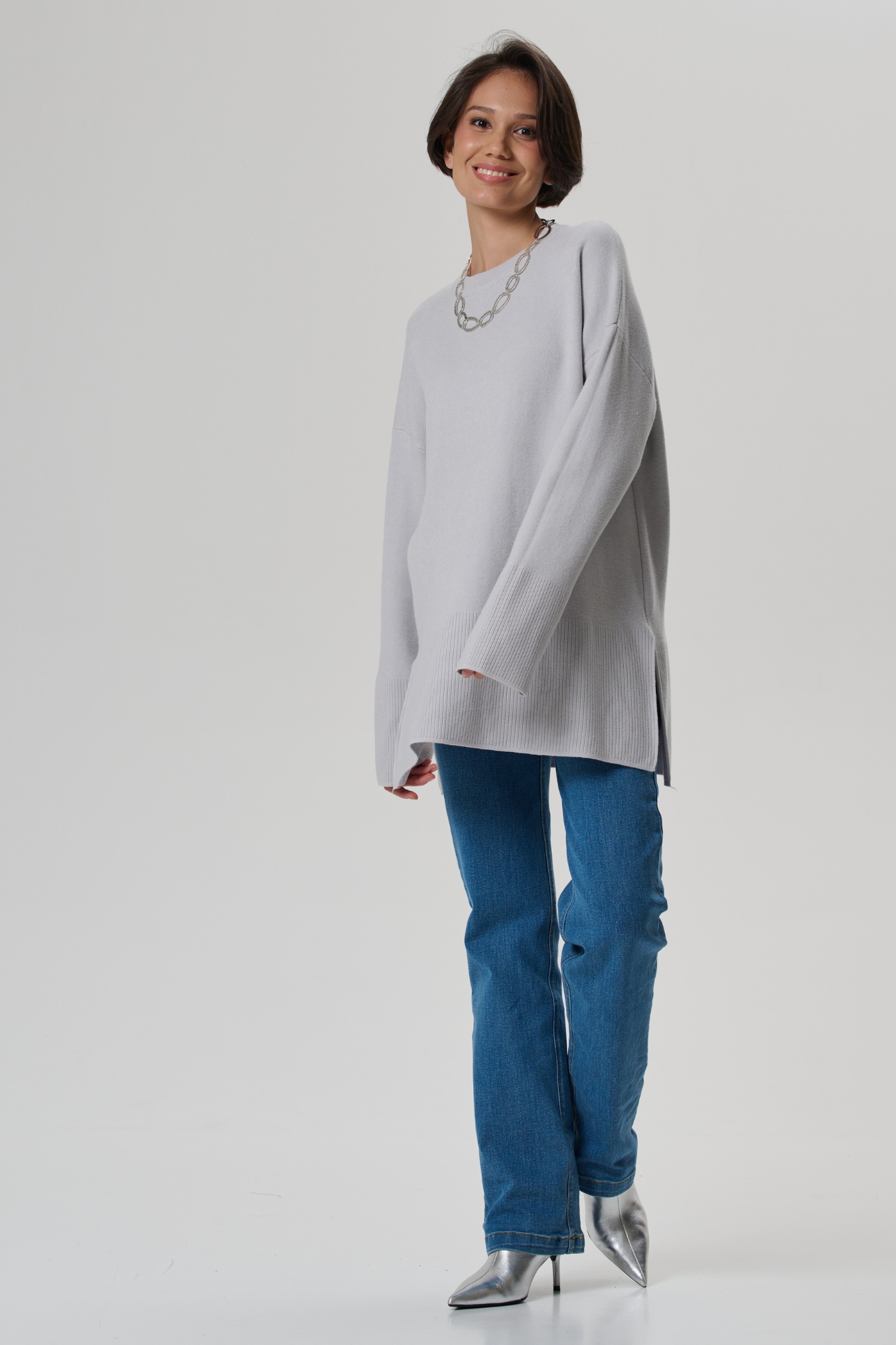 Аккуратная круглая горловина на широкой резинке. Просторные рукава и низ изделия так же разбавлены классической вязаной резинкой. В боковых швах предусмотрены разрезы для дополнительного удобства. Спущенное плечо мягко подчеркивает плечи. Просторный гладко вязанный фасон оверсайз не сковывает движений, будет удобен на любом сроке и после родов.