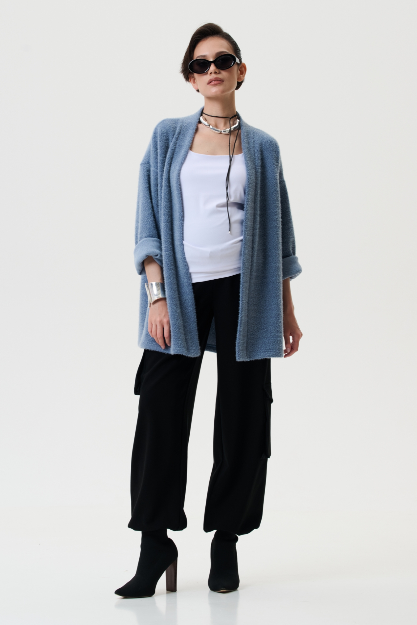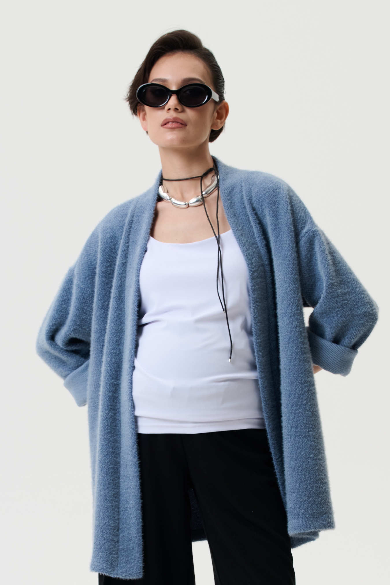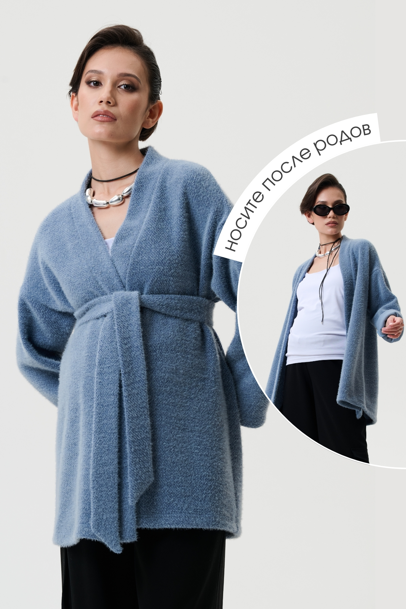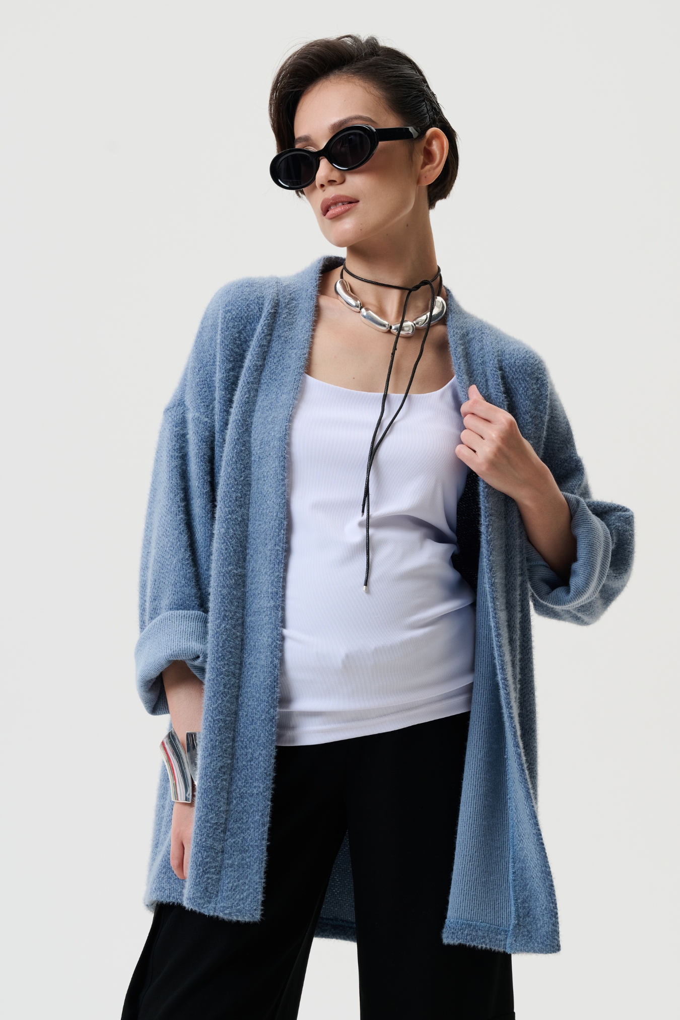 Мягкий пушистый кардиган женский демисезонный — универсальная вещь на весну и осень, которую можно носить во время беременности и после родов. Свободный крой оверсайз и спущенное плечо обеспечивают комфорт и свободу движений, а пояс позволяет регулировать посадку по фигуре. Кардиган без застежки, без карманов и без капюшона — лёгкий и удобный вариант для повседневных образов. Длина миди до середины бедра делает модель удобной и практичной.