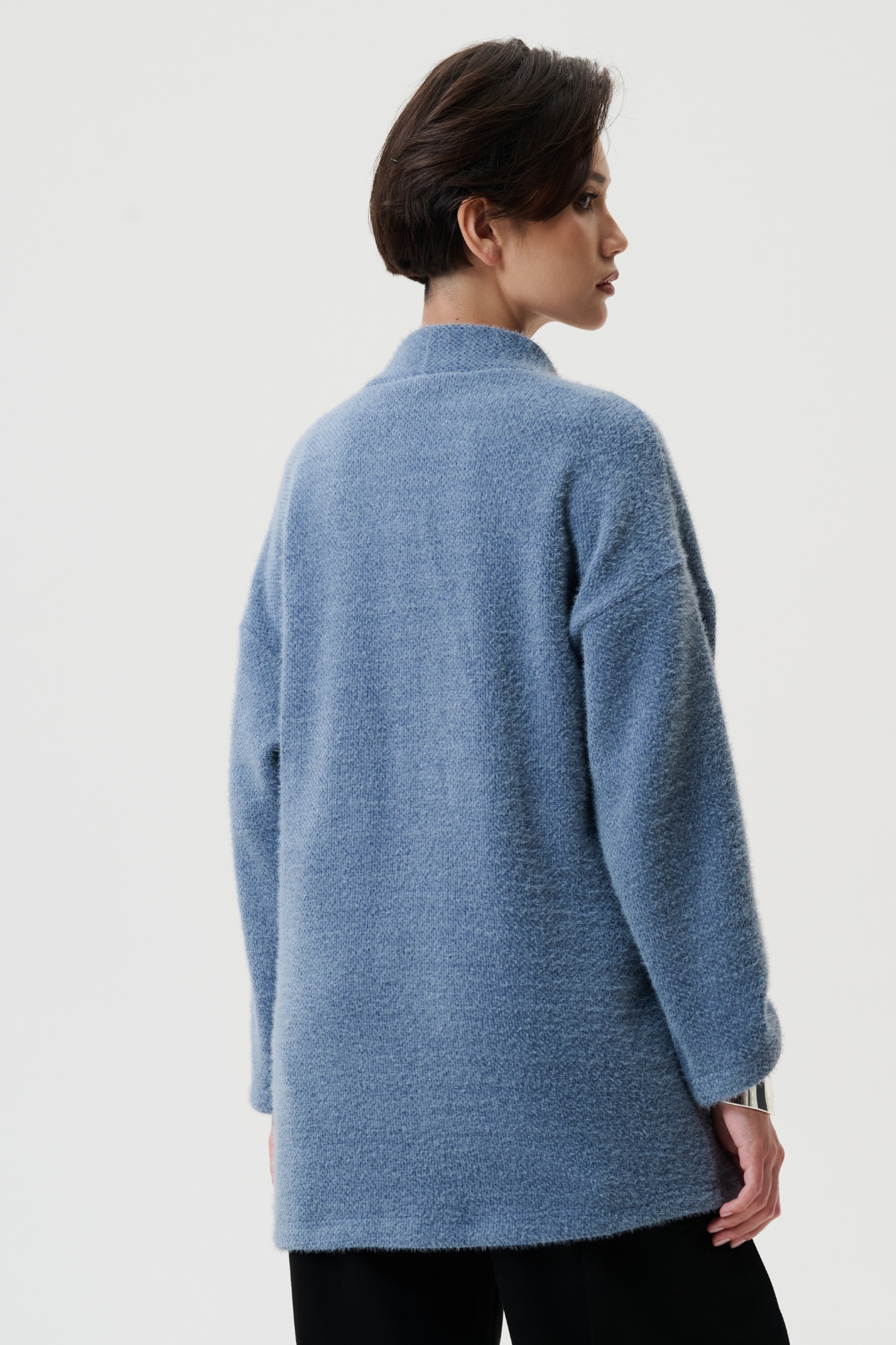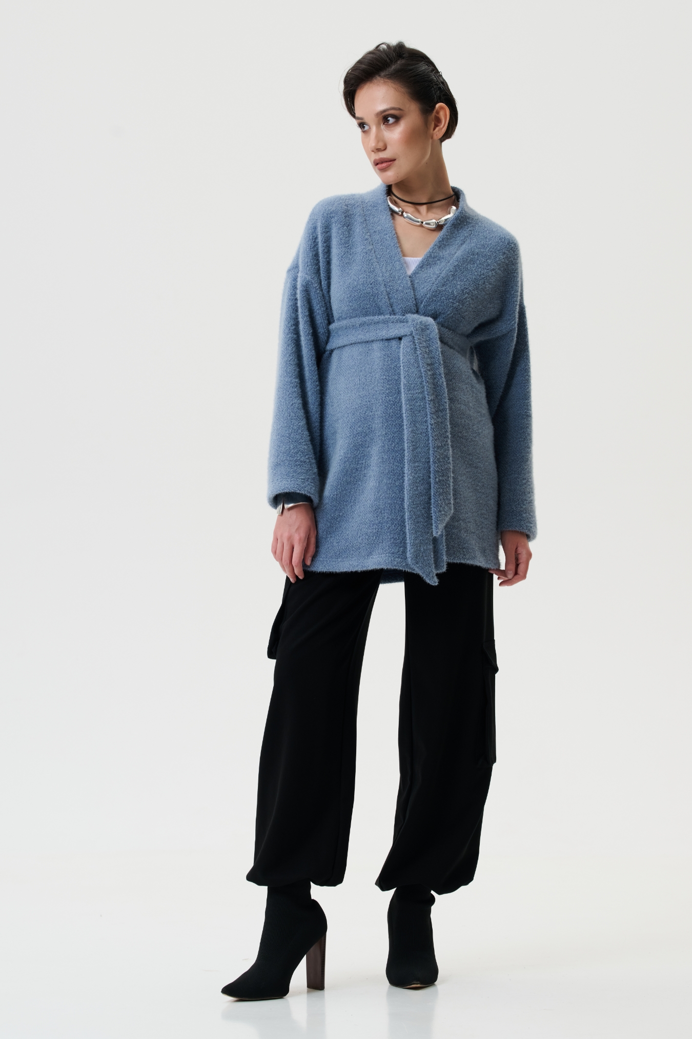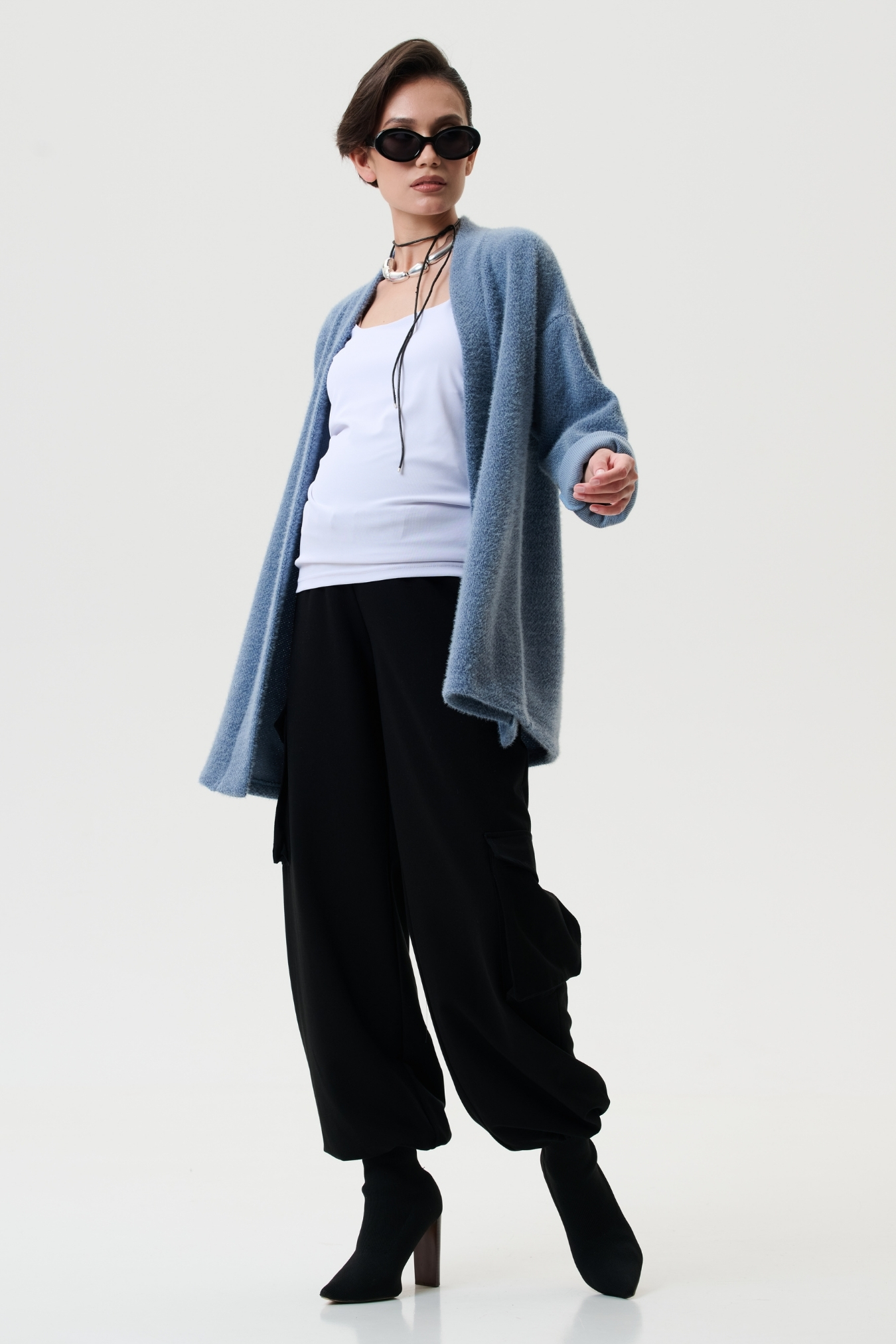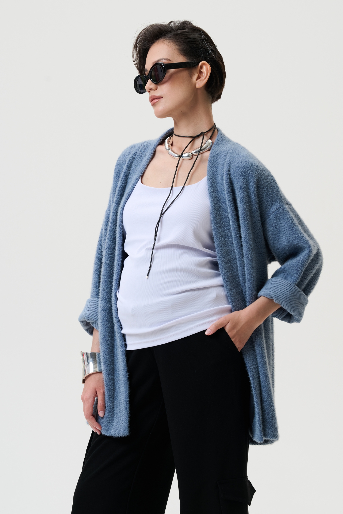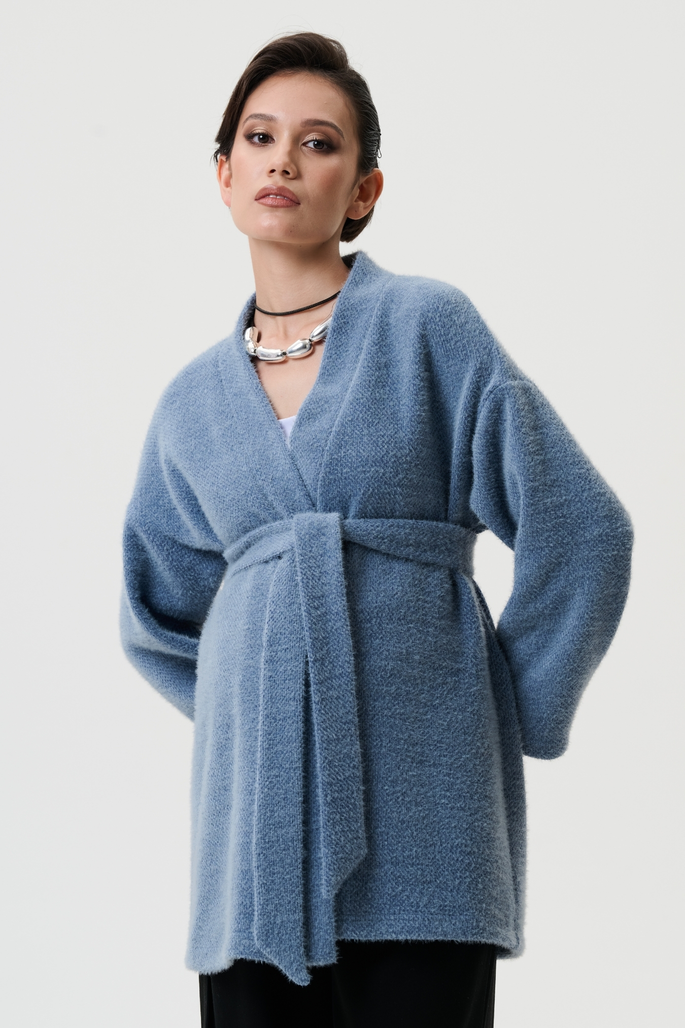 Мягкий пушистый кардиган женский демисезонный — универсальная вещь на весну и осень, которую можно носить во время беременности и после родов. Свободный крой оверсайз и спущенное плечо обеспечивают комфорт и свободу движений, а пояс позволяет регулировать посадку по фигуре. Кардиган без застежки, без карманов и без капюшона — лёгкий и удобный вариант для повседневных образов. Длина миди до середины бедра делает модель удобной и практичной.