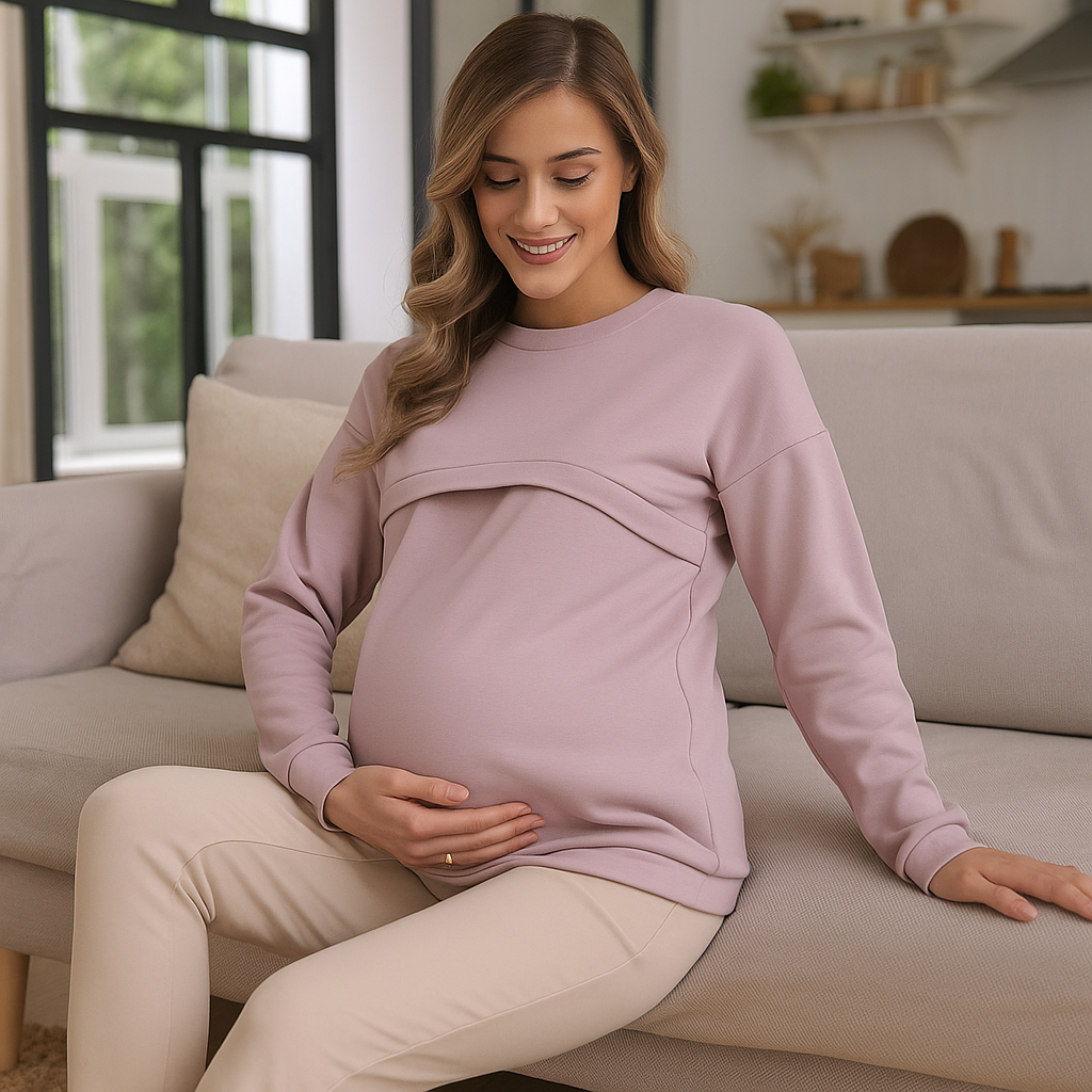 Базовый свитшот оверсайз женский создан с любовью, в нем продумано всё до мелочей. Кофта женская с длинным рукавом для беременных имеет специальные замочки для кормления, что позволит носить свитшот не только во время беременности, но и после рождения малыша. Толстовка женская без начеса достаточно свободная за счет особенностей кроя и отлично подойдет для любого типа фигуры. Кофта с длинным рукавом без капюшона без рисунка.