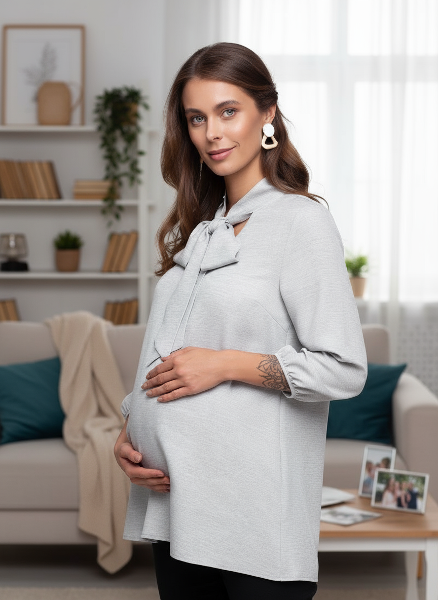Изысканная туника для беременных и кормящих. Силуэт: А-образный и свободный. Секрет кормления: потайная молния в центральном шве переда. Отделка: объемный бант на шее. Ткань: плательная вискоза. Длина по спинке в размере М: 76 см. Длина рукава: 47,2 см. Цвет: светло-серый меланж.