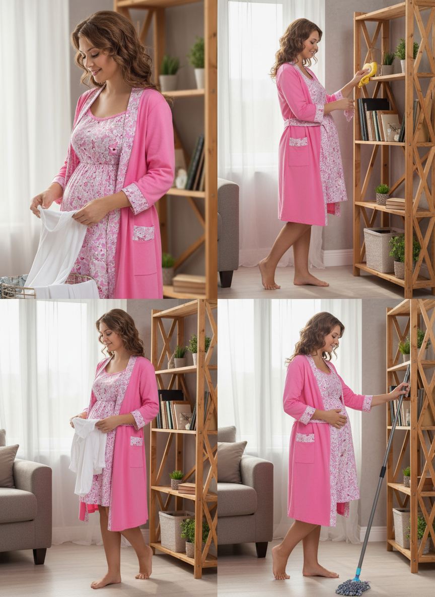 Комплект состоит из сорочки для беременных/кормящих и халата. Выполнен из 100% хлопкового полотна. Халат очень удобен в носке, имеет дополнительные завязочки с внутренней стороны по линии талии, а также функциональные накладные карманы. Изготовлен халатик из однотонного полотна с контрастной отделкой планок, манжет рукавов и манжет карманов. Сорочка выполнена из набивного полотна, имеет приталенный силуэт, образованный за счет сборки под грудью, что обеспечивает нежное облегание растущего животика. Для удобства при надевании и кормлении сорочка имеет застежки-клипсы, благодаря которым можно кормить малыша, не снимая сорочки. В этом комплекте вы будете чувствовать себя комфортно и привлекательно. Состав: хлопок 100%