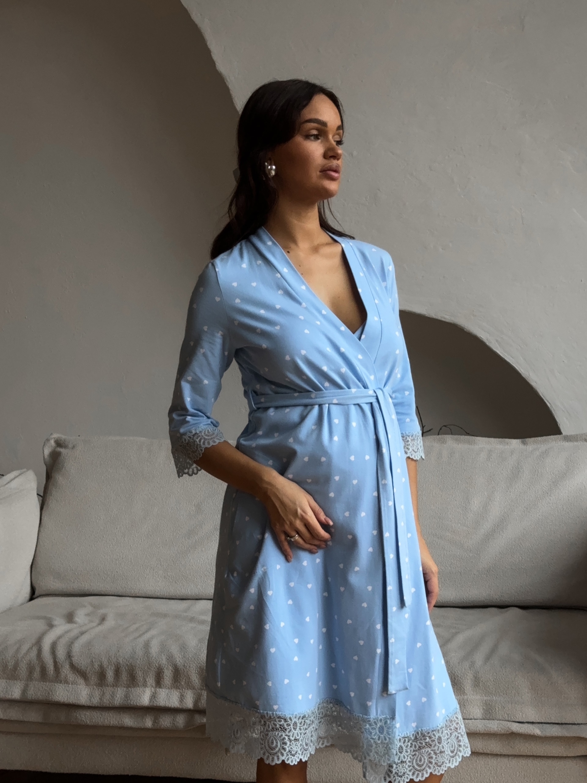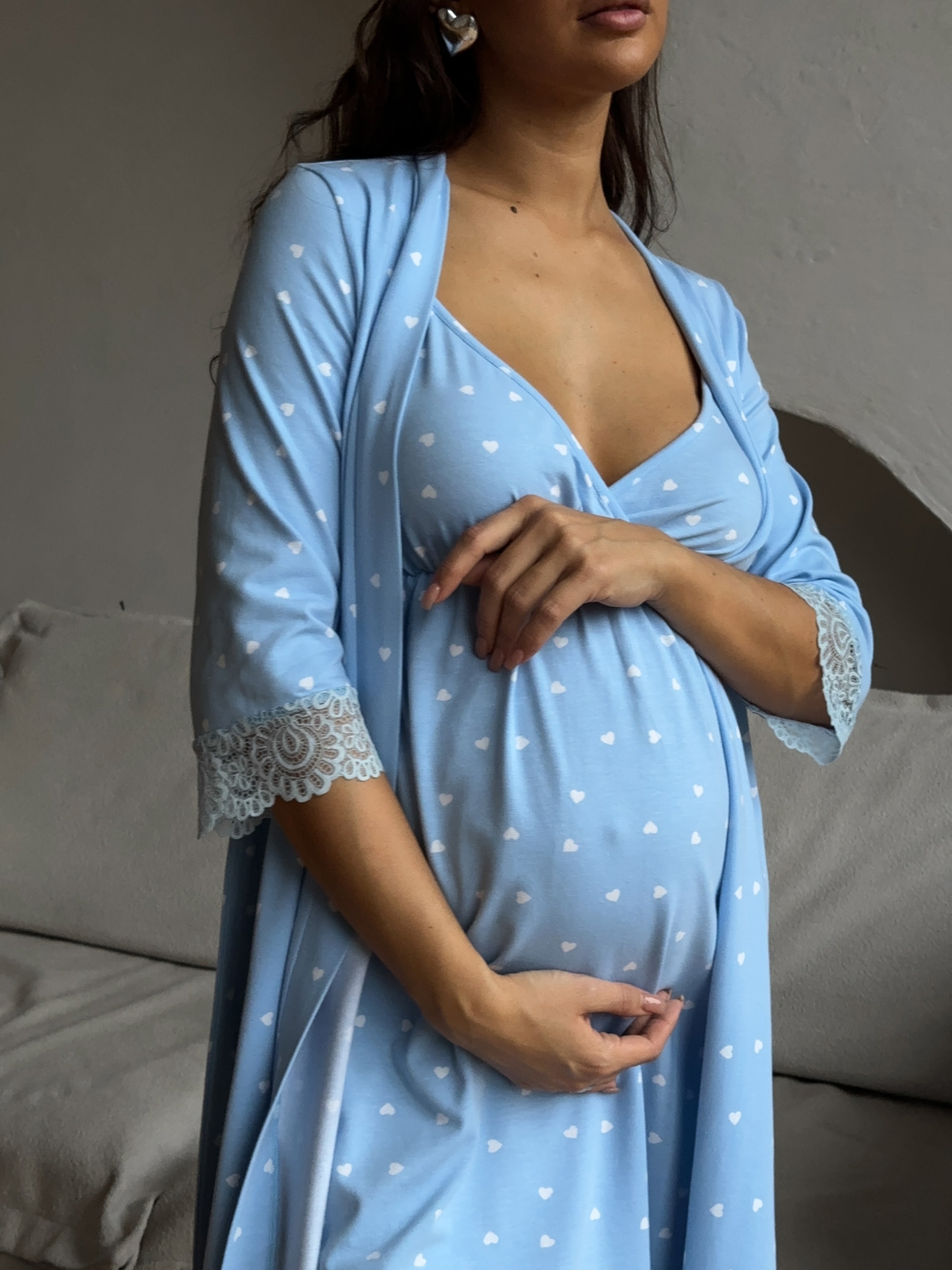 Халат и сорочка для беременных и кормящих прекрасно подходит в качестве комплекта в роддом, а также как красивая и стильная домашняя одежда. В состав изделия входит натуральный хлопок, благодаря которому маме будет уютно и тепло, а небольшое содержание эластана обеспечивает гибкость ткани и придаст легкости в движениях. Ночнушка и халат для беременных женщин не сдавливают увеличивающийся в размерах или уже большой животик. Сорочка для кормления малыша не ограничивает движения, а также имеет специальный крой, который позволяет быстро и легко добраться до груди. Благодаря кружевным вставкам на рукавах и по низу халата Вы всегда будете выглядеть изысканно и элегантно, а оптимальная длина изделия обеспечит комфорт в любое время года.