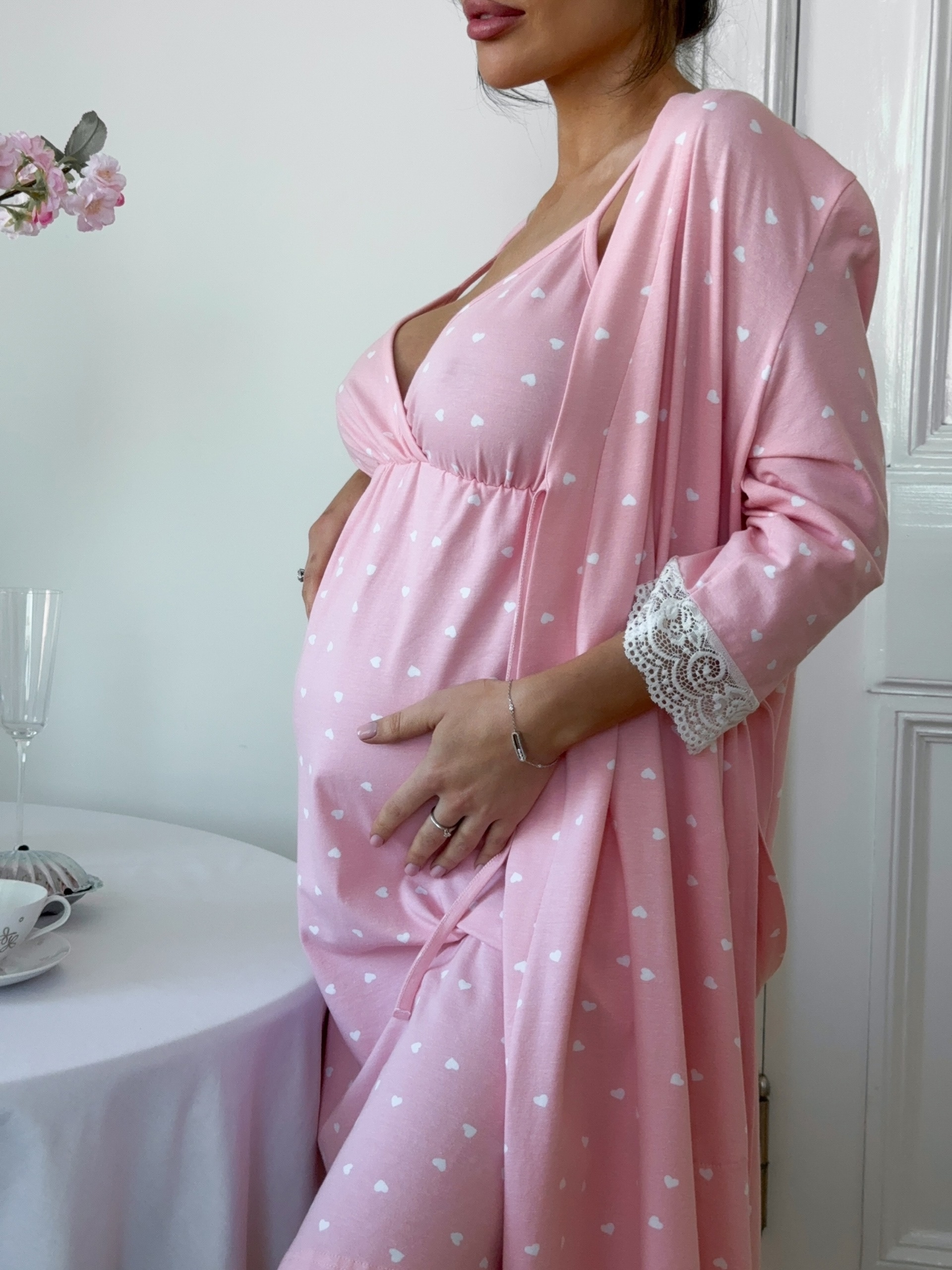 Халат и сорочка для беременных и кормящих прекрасно подходит в качестве комплекта в роддом, а также как красивая и стильная домашняя одежда. В состав изделия входит натуральный хлопок, благодаря которому маме будет уютно и тепло, а небольшое содержание эластана обеспечивает гибкость ткани и придаст легкости в движениях. Ночнушка и халат для беременных женщин не сдавливают увеличивающийся в размерах или уже большой животик. Сорочка для кормления малыша не ограничивает движения, а также имеет специальный крой, который позволяет быстро и легко добраться до груди. Благодаря кружевным вставкам на рукавах и по низу халата Вы всегда будете выглядеть изысканно и элегантно, а оптимальная длина изделия обеспечит комфорт в любое время года.
