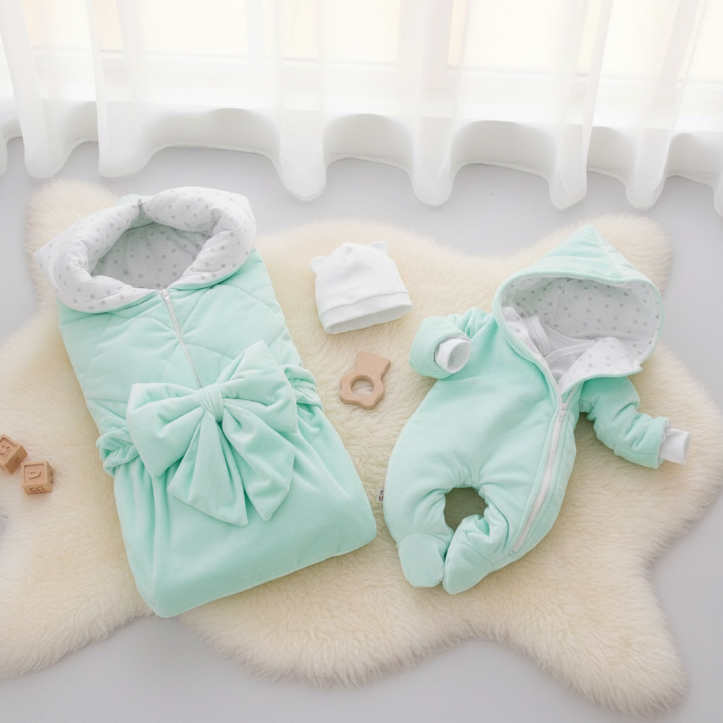Демисезонный комплект на выписку "Фантазия" Комплектация: 1. Одеяло 70х75 см из плюша 2. Бант на резинке из плюша 3. Шапочка легкая с ушками 4. Комбинезон-слип 5. Комбинезон утепленный Состав одеяла: верх - плюш (п/э 100%), наполнитель синтепон 200 г/м2, подклад - трикотаж кулир высшего качества (хлопок 100%) Состав комбнезона: верх - плюш (п/э 100%), подклад - трикотаж кулир высшего качества (хлопок 100%), наполнитель - синтепон 100 г/м2 Состав одежды: трикотаж интерлок высшего качества (хлопок 100%) Цвет одеяла и комбинезона: мята Цвет комплекта одежды: белый