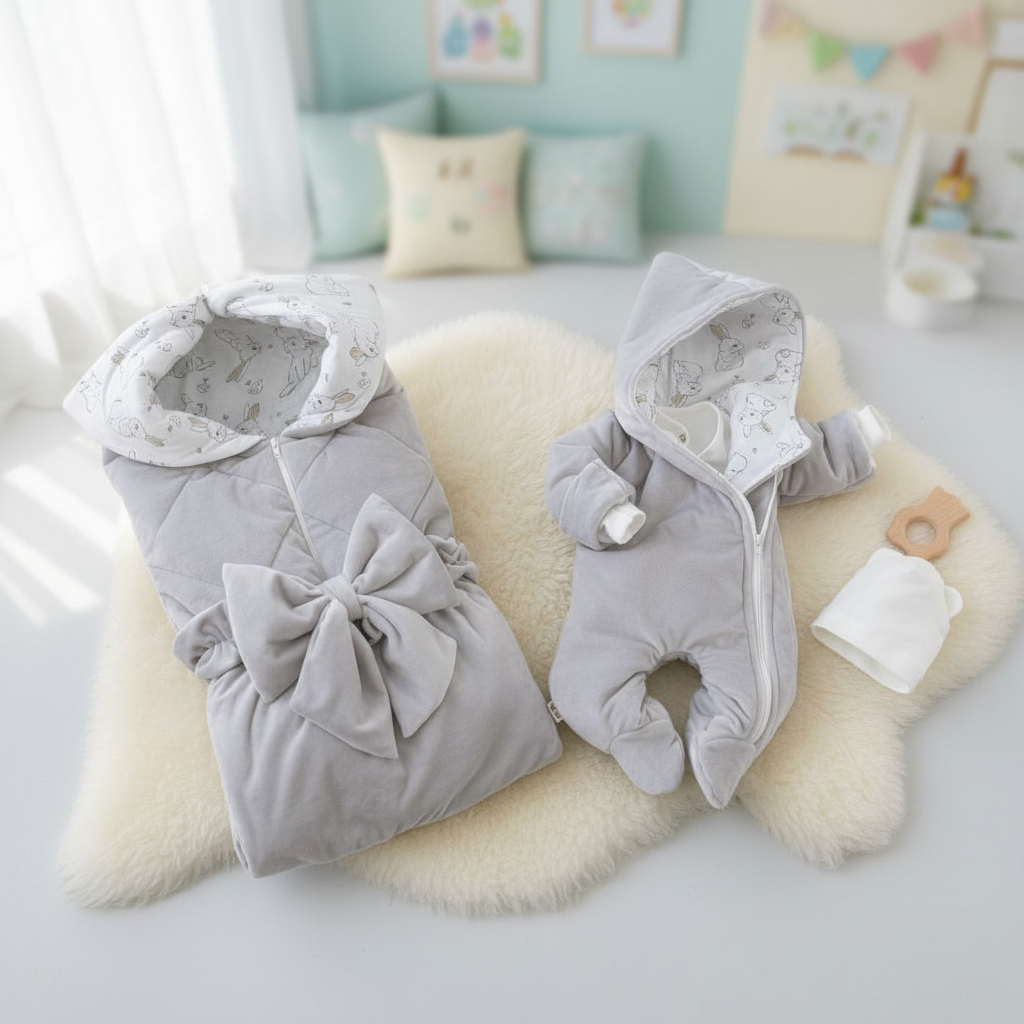 Демисезонный комплект на выписку "Фантазия" Комплектация: 1. Одеяло-конверт 70*75 2. Бант на резинке из плюша 3. Шапочка легкая с ушками 4. Комбинезон-слип 5. Комбинезон утепленный Состав одеяла-конверта: верх - плюш (п/э 100%), наполнитель синтепон 200 г/м2, подклад - трикотаж кулир высшего качества (хлопок 100%) Состав комбнезона: верх - плюш (п/э 100%), подклад - трикотаж кулир высшего качества (хлопок 100%), наполнитель - синтепон 100 г/м2 Состав одежды: трикотаж интерлок высшего качества (хлопок 100%) Цвет одеяла-конверта и комбинезона: серый Цвет комплекта одежды: белый