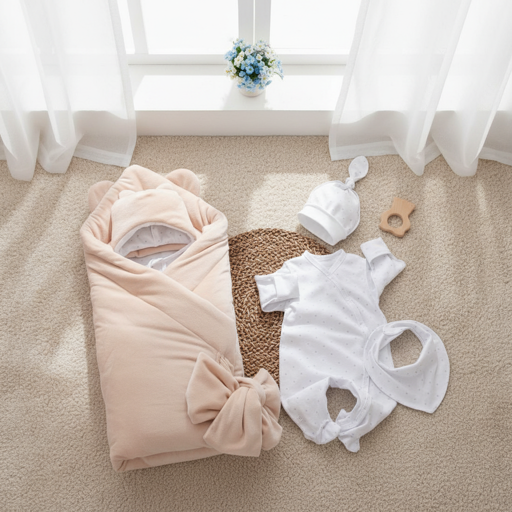 Универсальный демисезонный комплект на выписку из 5 предметов - "Узелок-2" Мягкий и в то же время нарядный комплект – отличный вариант для выписки из роддома весной и осенью В комплекте: 1. Одеяло с бантом 90х90 см 2, Шапочка утепленная 3. Комбинезон-слип 4. Шапочка легкая на манжете с узелком 5. Нагрудник косынка Размер: 16 (рост 56см) Цвет одеяла: бежевый Состав одеяла и банта: верх - Плюш ( п/э 100%), наполнитель синтепон 200 г/м2, подклад - трикотаж кулир (хлопок 100%) Состав шапочки: верх - Плюш (п/э 100%), наполнитель - синтепон 100 г/м2, подклад - трикотаж кулир (хлопок 100%) Состав комплекта одежды: кулир (хлопок 100%)
