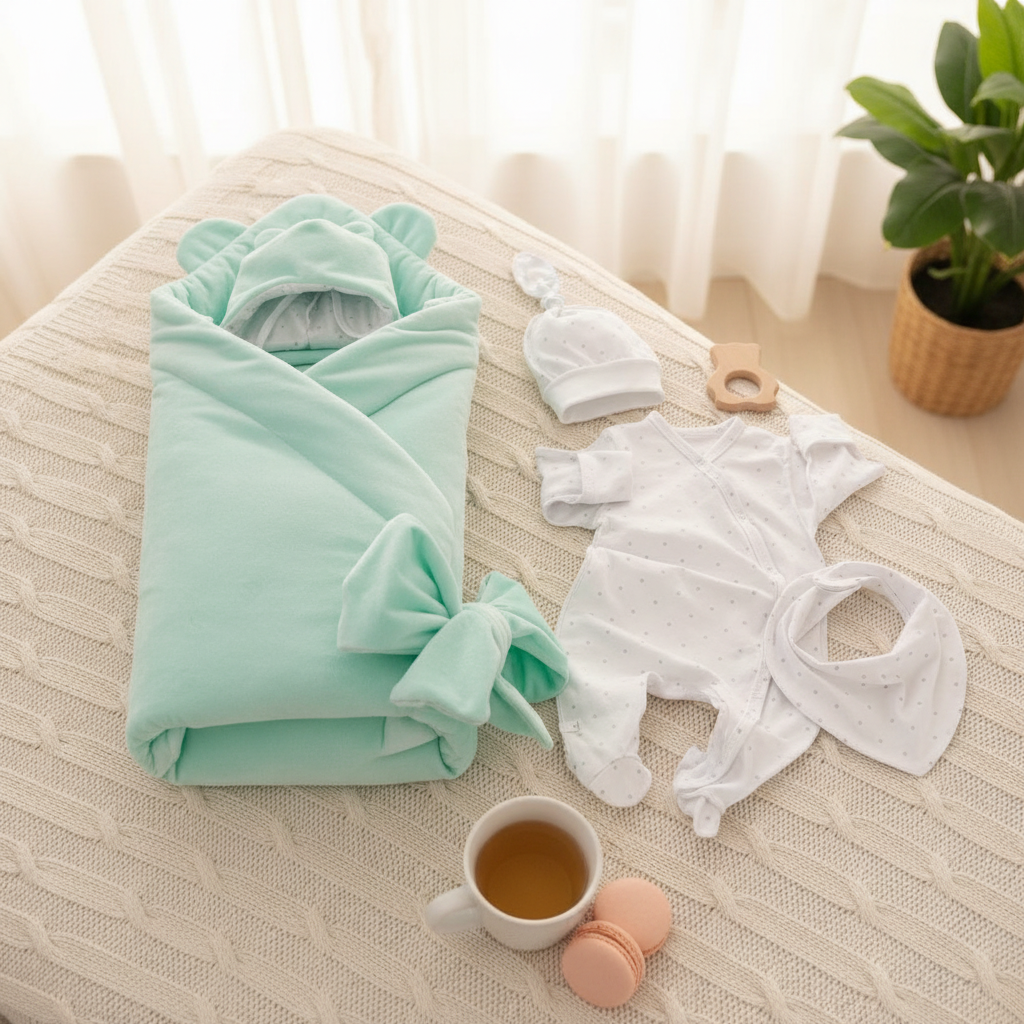 Универсальный демисезонный комплект на выписку из 5 предметов - "Узелок-2" Мягкий и в то же время нарядный комплект – отличный вариант для выписки из роддома весной и осенью В комплекте: 1. Одеяло с бантом 90х90 см 2, Шапочка утепленная 3. Комбинезон-слип 4. Шапочка легкая на манжете с узелком 5. Нагрудник косынка Размер: 16 (рост 56см) Цвет одеяла: мята Состав одеяла и банта: верх - Плюш ( п/э 100%), наполнитель синтепон 200 г/м2, подклад - трикотаж кулир (хлопок 100%) Состав шапочки: верх - Плюш (п/э 100%), наполнитель - синтепон 100 г/м2, подклад - трикотаж кулир (хлопок 100%) Состав комплекта одежды: кулир (хлопок 100%)