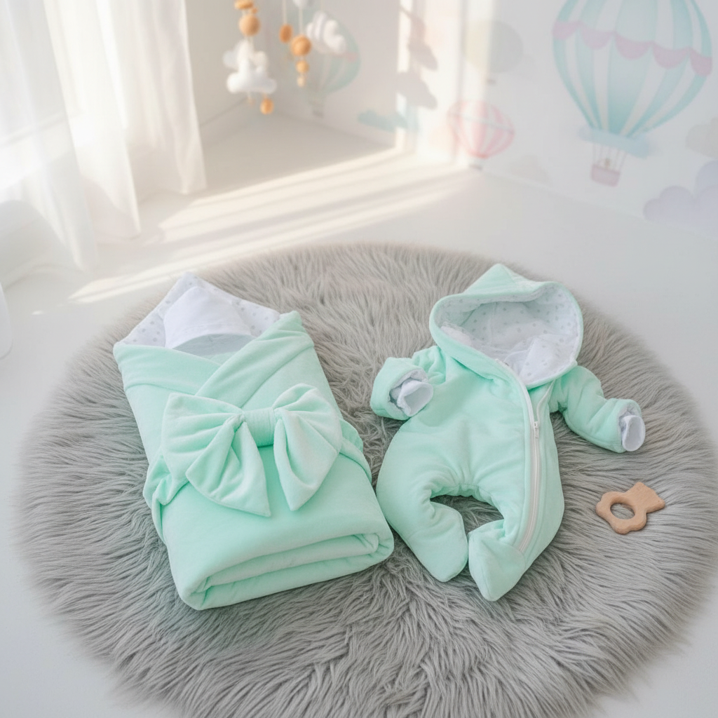 комплект на выписку "Пломбир" Комплектация: 1. Одеяло 90х90см из плюша 2. Бант на резинке из плюша 3. Шапочка легкая с ушками 4. Комбинезон-слип 5. Комбинезон утепленный Состав одеяла: верх - плюш (п/э 100%), наполнитель синтепон 200 г/м2, подклад - трикотаж кулир высшего качества (хлопок 100%) Состав комбнезона: верх - плюш (п/э 100%), подклад - трикотаж кулир высшего качества (хлопок 100%), наполнитель - синтепон 100 г/м2 Состав одежды: трикотаж интерлок высшего качества (хлопок 100%) Цвет одеяла и комбинезона: мята Цвет комплекта одежды: белый