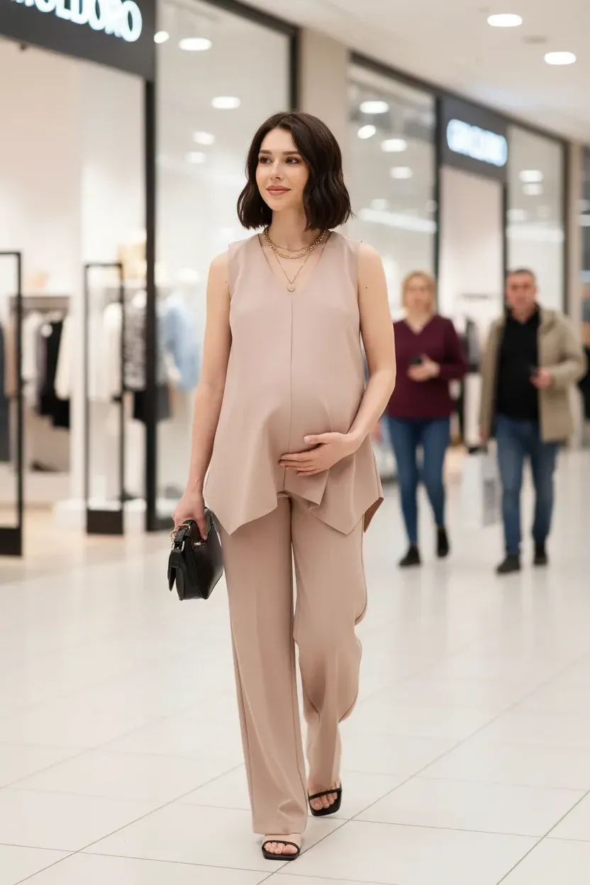 Легкий брючный костюм для беременных теплого бежевого оттенка. Комплект женский состоит из туники и брюк. Туника имеет просторный расклешенный силуэт без рукавов с ассиметричным фигурным низом. Оригинальная полочка с V-образной горловиной состоит из 2х частей на запах, скрепленная в области груди. Брюки свободные классические в стиле палаццо со стрелками, есть боковые карманы. Пояс широкий с трикотажной вставкой, которая будет поддерживать животик. Резинка с пуговицей в поясе помогут регулировать объем. Наряд подойдет на всем сроке и после родов. Модель универсальна в плане сезонности, ее можно надеть как в теплый весенний и осенний период, так и прохладным летом. Отличный вариант и для прогулки, и в офис.