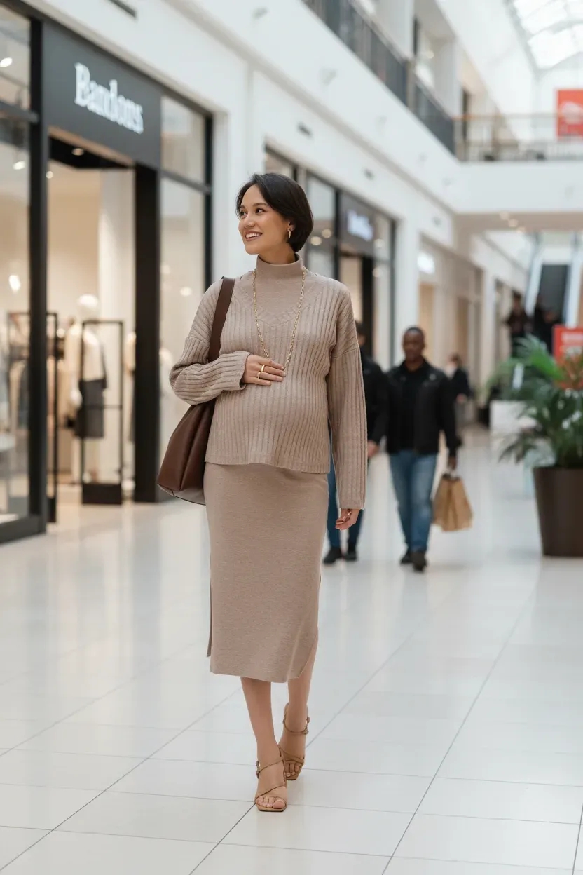 Трикотажный комплект для беременных кофейного оттенка из мягкого плотного материала. Костюм двойка состоит из джемпера и платья. Универсальная модель на осень и весну, в которой будет комфортно на всем сроке и после родов. Джемпер в рубчик в стиле оверсайз, имеет аккуратную V-образную горловину с широкой планкой. Модель со спущенным плечом и просторными рукавами. Имеет разрезы по бокам, которые добавят свободы и дополнительного удобства для растущего животика. Платье миди облегающего силуэта без рукавов из гладко вязанного трикотажа. Воротник-стойка, проймы отделаны кантом. Высокие боковые разрезы разбавят минималистичный дизайн. Дополнить образ помогут аксессуары.