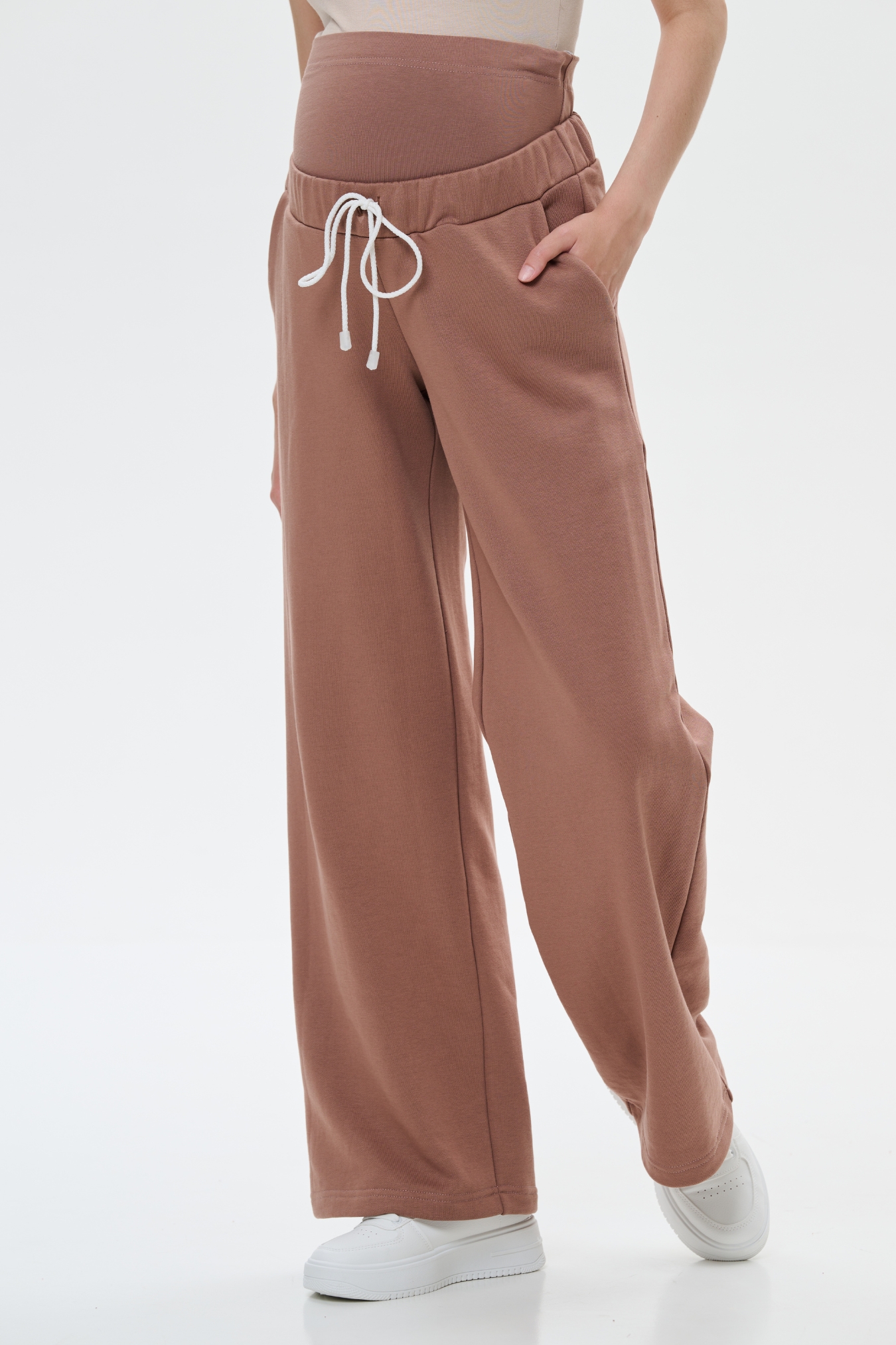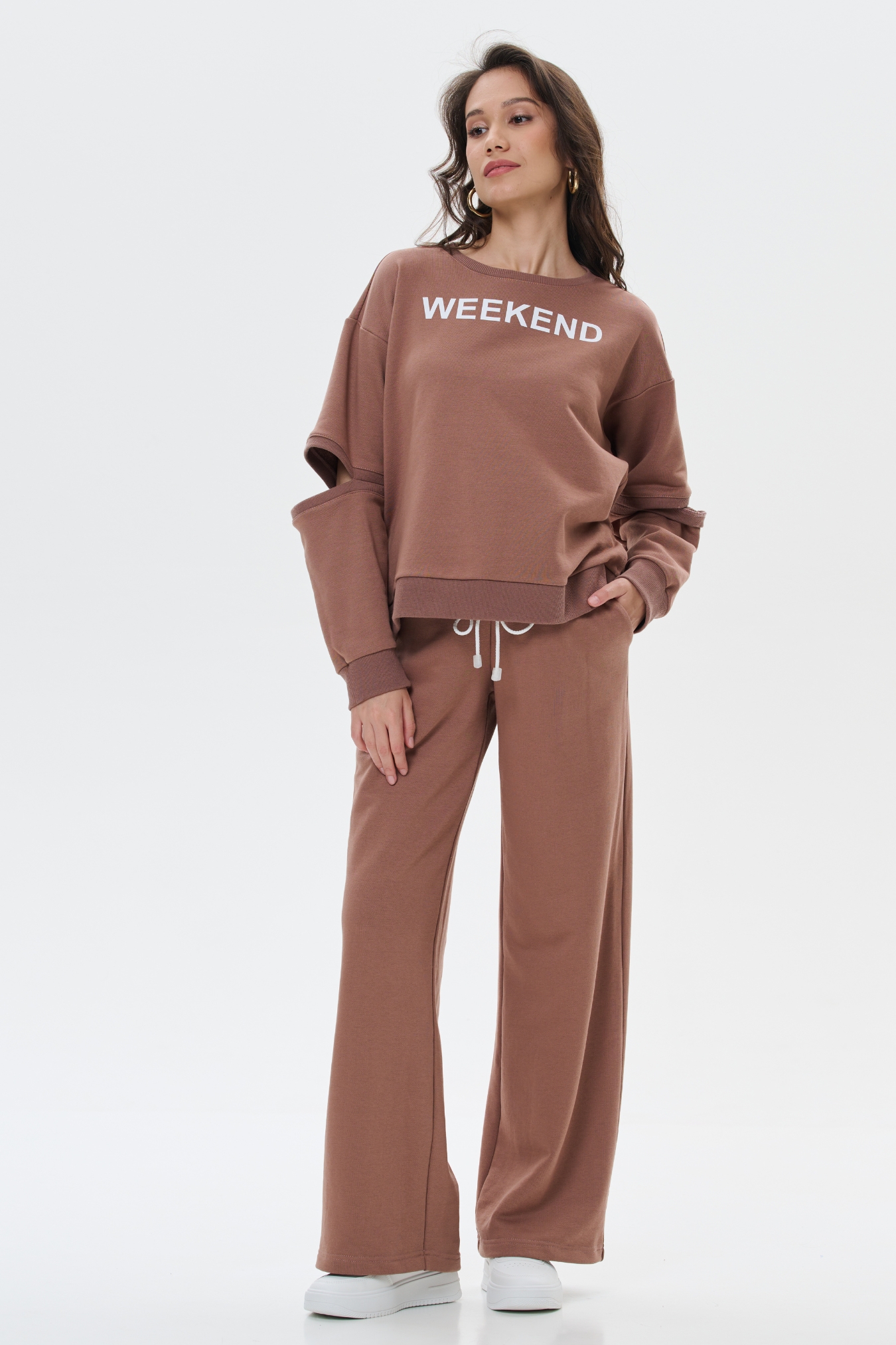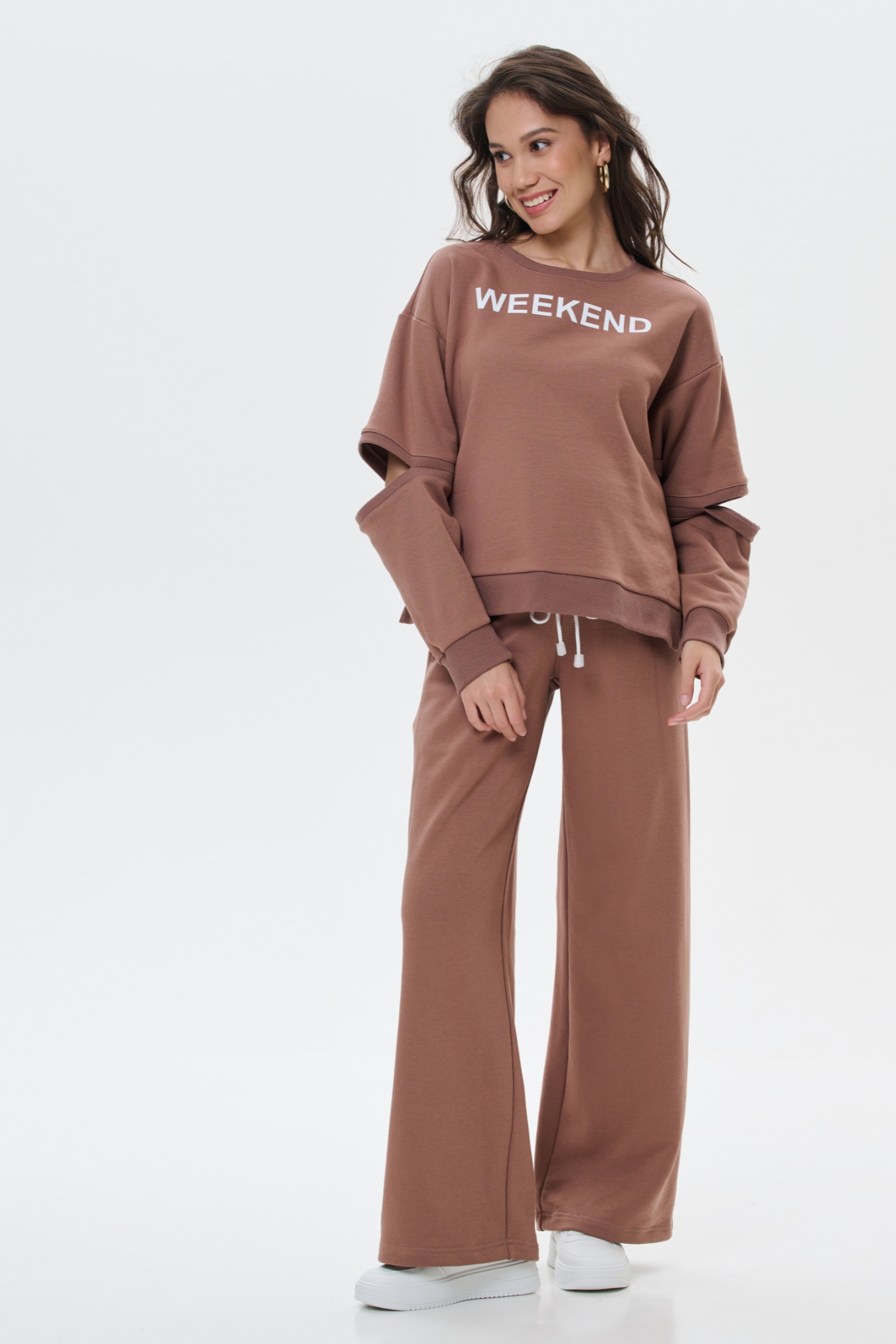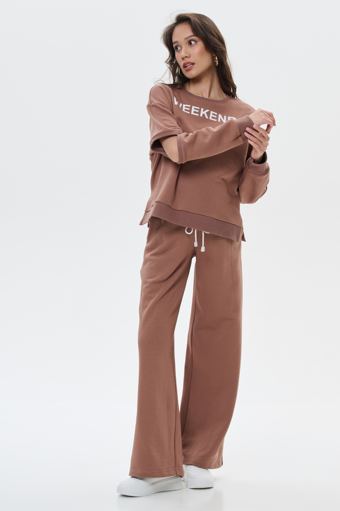 Джемпер оверсайз с аккуратной круглой горловиной и контрастным принтом на груди. Рукав длинный свободный со спущенным плечом. Изюминкой модели выступают оригинальные разрезы на локтях. Свободный силуэт с боковыми разрезами будет удобен на всем сроке и после родов. Низ рукавов и джемпера на манжетах. Брюки палаццо просторного силуэта, имеют боковые карманы, дополнены трикотажным бандажом для поддержания животика. Отрегулировать объем поможет потайная резинка с пуговицей.
