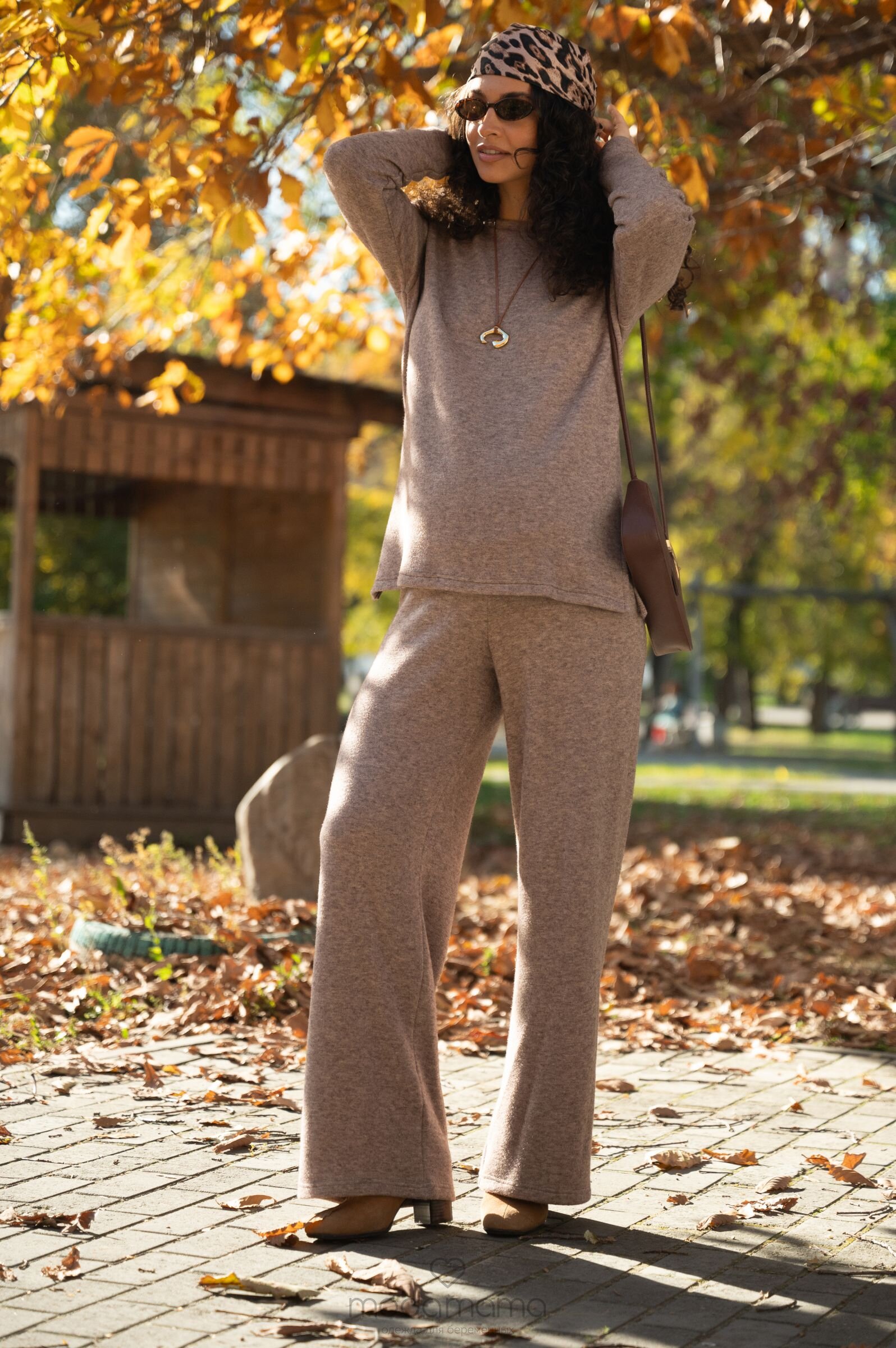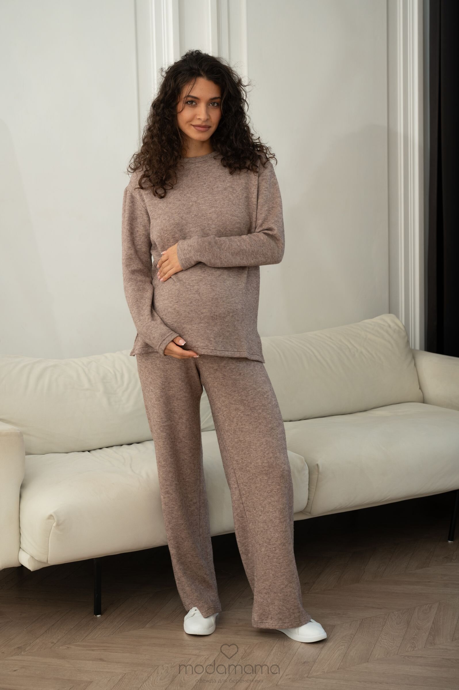 Брючный костюм для беременных. Прямой силуэт джемпера с разрезами по бокам позволяет носить его как во время, так и после беременности. Широкие брюки с высоким круговым бандажем из основной ткани регулируются пуговкой по верху. Выполнен из мягкого, эластичного, тёплого вязаного трикотажа. Каждый элемент костюма можно носить по отдельности и сочетать с другими вещами в гардеробе.