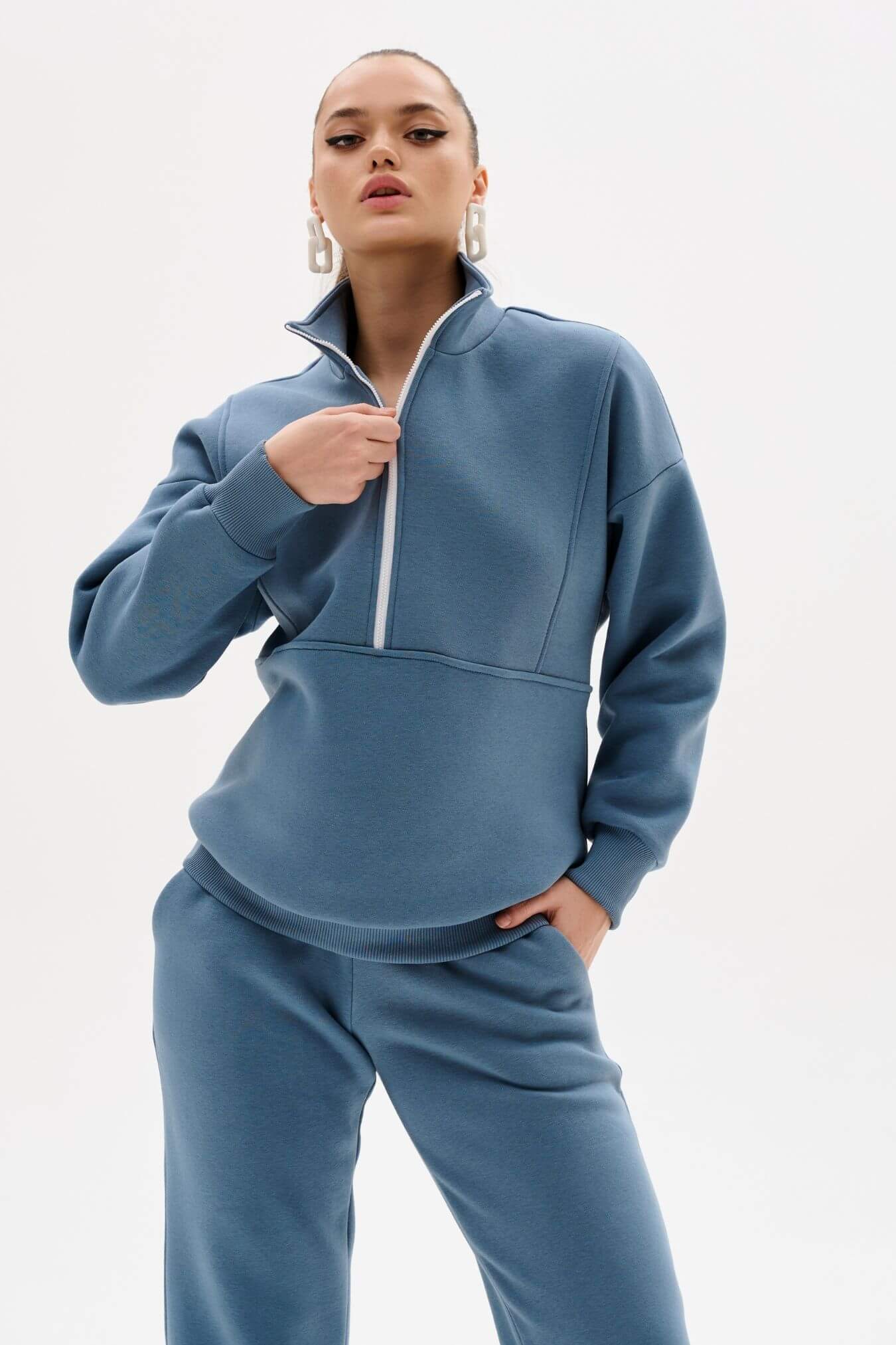 Костюм для беременных и кормящих мам из мягкого плотного футера с начесом. Состоит из джемпера и брюк. Универсальная модель, в которой будущей маме будет комфортно на всем сроке беременности и после родов. Джемпер имеет воротник-стойку и глубокую молнию на груди, расстегнув которую модель можно использовать как джемпер для кормления. Рукав длинный свободный со спущенным плечом. Брюки для беременных женщин просторного силуэта, имеют боковые карманы, дополнены широкой вставкой для поддержания животика. Отрегулировать объем поможет потайная резинка с пуговицей.