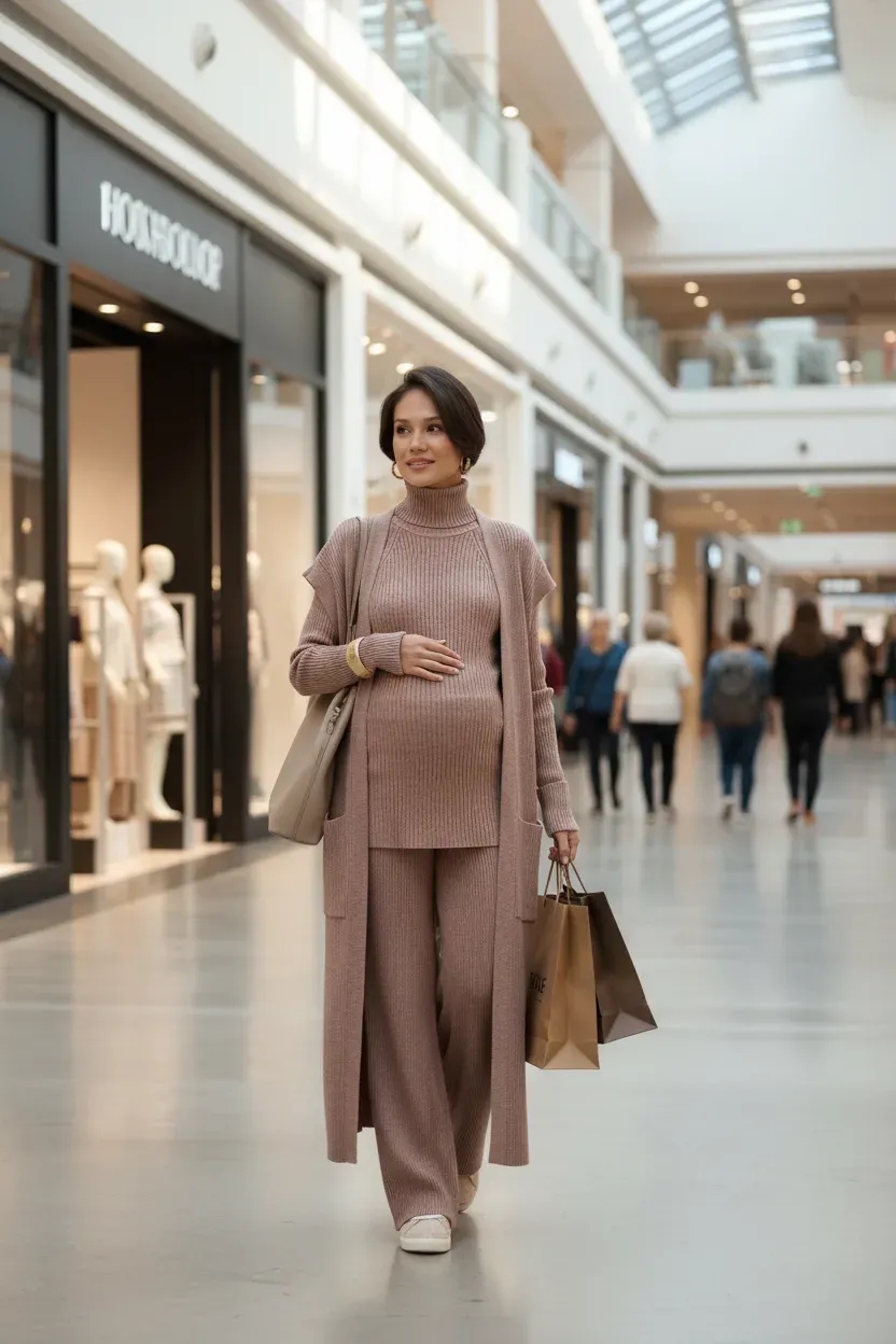 Трикотажный комплект для беременных кофейного оттенка из мягкого плотного полотна в рубчик. ВНИМАНИЕ! Размер one size подойдет на 42-48! Костюм тройка состоит из кардигана, джемпера и брюк. Универсальная модель, в котором будет комфортно на всем сроке и после родов. Удлиненный кардиган прямого силуэта без рукавов со спущенным плечом,по бокам накладные карманы и высокие разрезы. Джемпер имеет цельновыкроенный рукав-реглан и воротник-стойку с отворотом. Брюки палаццо просторного силуэта на широкой резинке, имеют высокую посадку. Внутри пояса шнурок для регулировки объема. Эластичный материал приятен к телу и будет удобен для растущего животика. Комплект с брюками подойдет как утепленный брючный офисный костюм из лапши. Теплый наряд станет прекрасным подарком подруге или девушке. Подойдет для высоких, невысоких и среднего роста девушек.