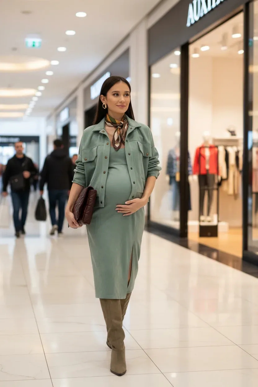 Костюм для беременных замшевый из мягкого плотного материала. Состоит из куртки и юбки.Универсальная модель, в которой будущей маме будет комфортно на всем сроке беременности и после родов. Куртка укороченная в джинсовой стилистике оверсайз с классическим отложным воротником, переходящим в планку на кнопках. Рукав свободный спущенный на манжетах. На груди большие накладные карманы с клапаном. Юбка облегающего силуэта длиной ниже колен.Талия завышена, фиксируется с помощью широкой резинки с внутренней стороны.Высокий разрез с левой стороны добавит образу кокетства.Линия низа и разрез с необработанным краем.Разбавить образ помогут украшения и аксессуары.