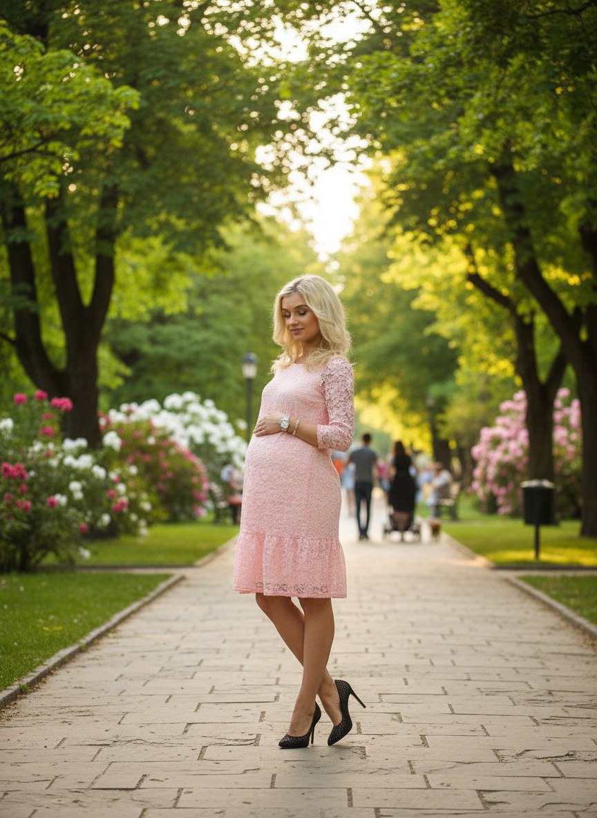 Платье кружевное для беременных женщин,трапециевидного силуэта,умеренного объема, на подкладе из трикотажного вискозного полотна. Конструктивная форма создана за счет нагрудных вытачек,плечевых вытачек и боковых швов. Рукав втачной,одношовный,длиной 3/4. Горловина круглой формы,обработана подкладом из трикотажа. По низу изделия притачан широкий волан со сборкой. Длина по спинке 92см, длина рукава 44,5 см для 42 размера.