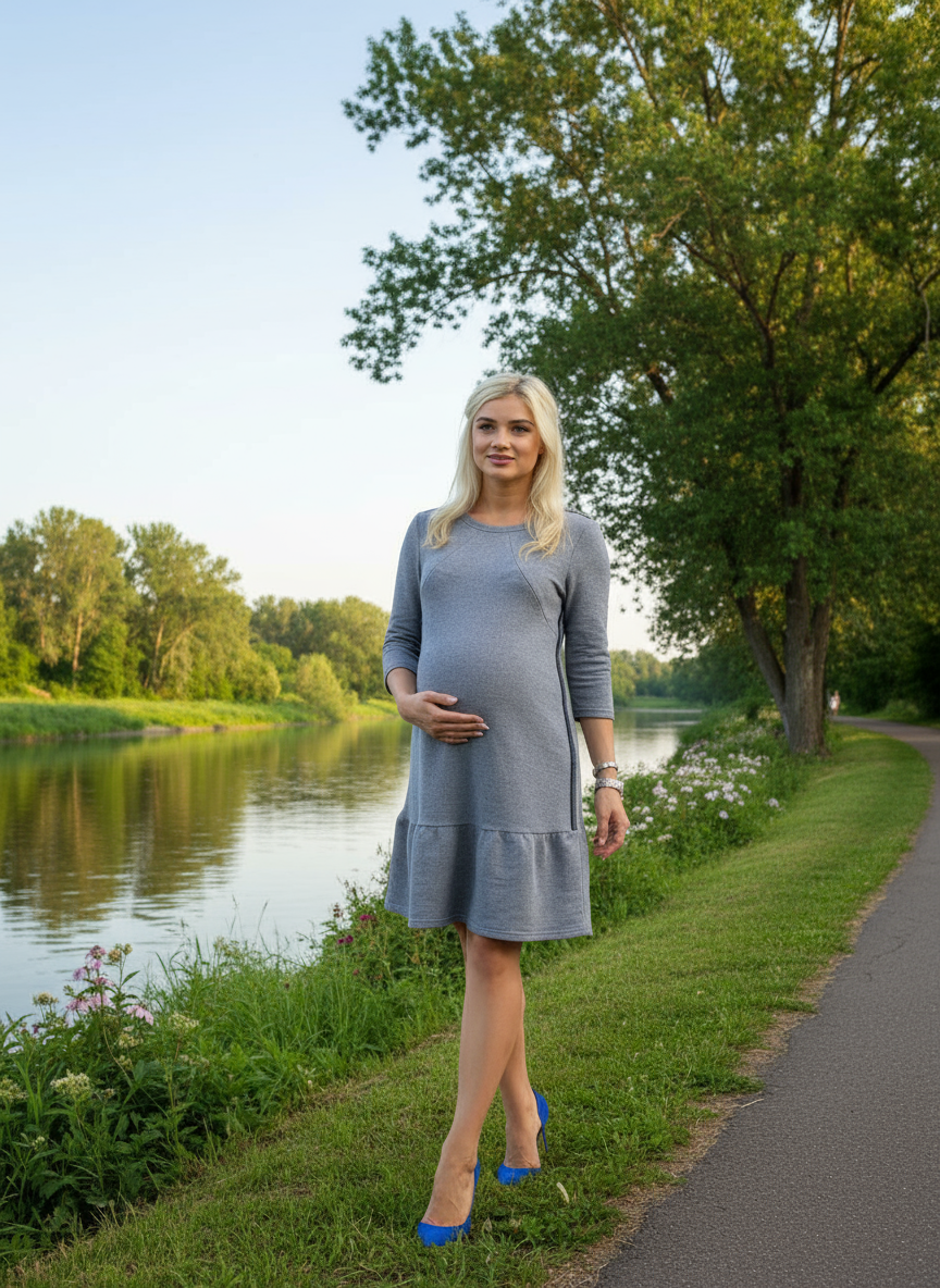 Платье для беременных и кормящих женщин трапециевидного силуэта, умеренного объема. Конструктивная форма создана за счет боковых швов,шва кокетки на переде,плечевых вытачек и среднего шва на спинке. В шов кокетки на переде втачаны потайные замки для кормления. Рукав втачной,одношовный ,прямой,длиной 3/4. По низу изделия притачан волан со сборкой. Горловина круглой формы, обработана широким руликом. По плечу переда и боковому шву (до волана) настрочен лампас. Длина по спинке 91см,длина рукава 43 см для 42 размера.
